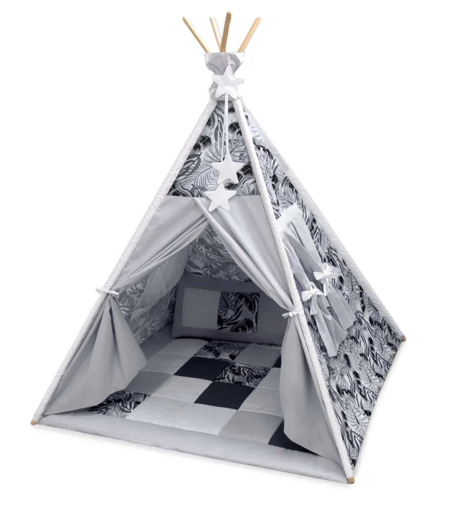 Zelt: 100 % Baumwolle. Holzstäbe: 100% Naturholz. Die Decke: Oberstoff 100% Baumwolle, Füllung: 100% Polyester. Das Kissen besteht aus: 1. Bezug (abnehmbar, mit Reißverschluss) – Oberstoff (eine Seite) 100% Baumwolle, Oberstoff (zweite Seite) 100% Baumwolle, Innenstoff: 100% Polypropylen, Füllung: 100% Polyester 2. Innenkissen-Oberstoff: 100% Polypropylen. Füllung: 100% Polyester. Das Tipi Zelt für Kinder ist einfach traumhaft.