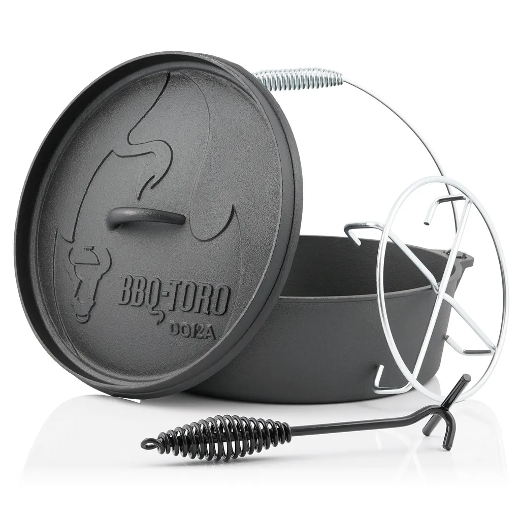 Der Dutch Oven ist ein schwerer, traditioneller, gusseiserner Topf und ein exakt passender Deckel mit dem man überall kochen, braten, schmoren, frittieren, dünsten und backen kann. Der Dutch Oven reguliert dank seiner hohen Masse (Gusseisen) ungleichmäßige Hitze und ermöglicht so ein gleichmäßiges Garen. Einfach glühende Kohlen, Glut oder Grillbriketts auf den Deckel und unter den Topf geben und das Dutch Oven-Erlebnis kann losgehen. Der extra erhöhte Deckelrand bietet optimale Bedingungen für Kohle und Co.