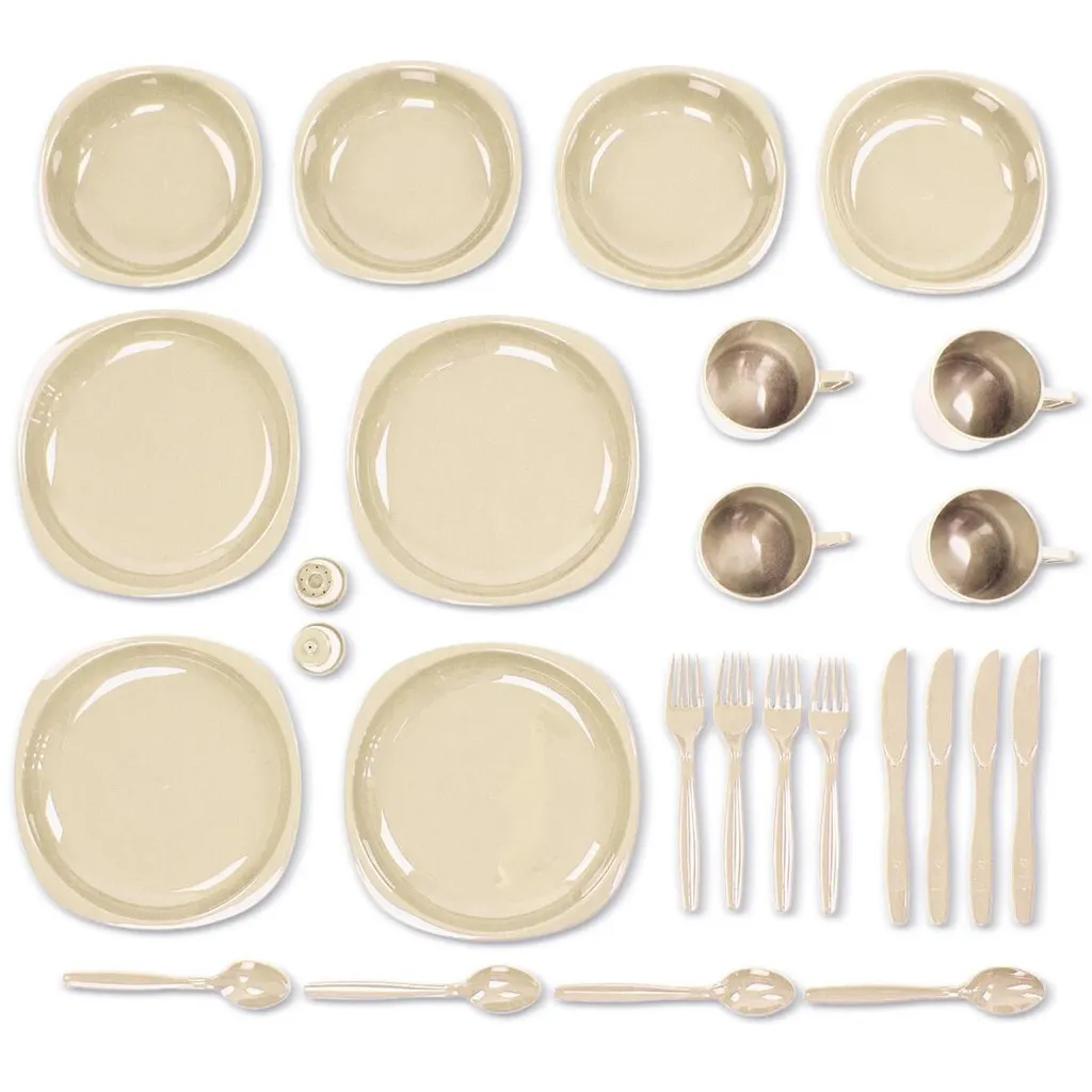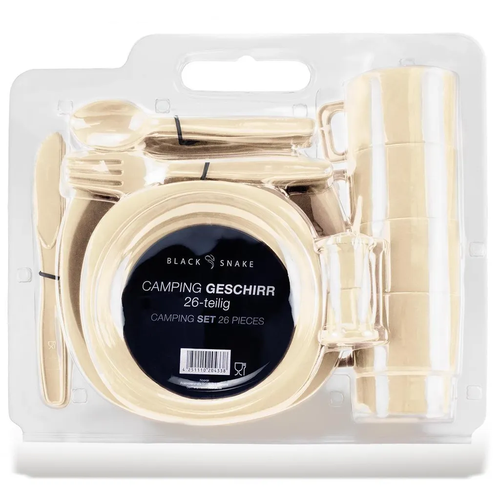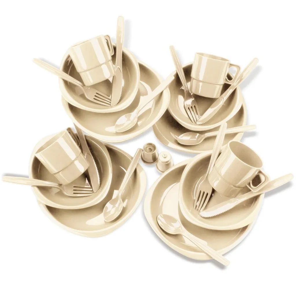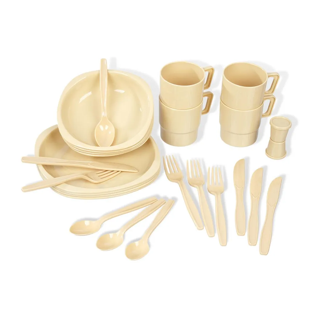 Das bruchfeste Geschirr eignet sich ideal für die Campingküche und es ist in diesem Set alles enthalten, was man für ein gemütliches Essen im Freien benötigt. Ob Sie sich für das Geschirr in Olivgrün, Beige, Türkis, Royal Blau oder für die bunte Version entscheiden, Sie haben mit diesem praktischen Geschirr die optimale Ergänzung zu Ihrer Campingausrüstung parat. Enthalten in dem umfangreichen Set sind je 4 Gabeln, 4 Messer, 4 Esslöffel, 4 Becher, 4 Teller und 4 Schüsseln. Ein Salzstreuer und ein Pfefferstreuer für das Nachwürzen bei Tisch dürfen hier natürlich auch nicht fehlen. Genießen Sie mit diesem stabilen Geschirr beispielsweise Ihre auf dem Grill zubereiteten Speisen und Ihren Morgenkaffee auf dem Campingplatz. Für eine platzsparende Aufbewahrung lässt es sich einfach stapeln.