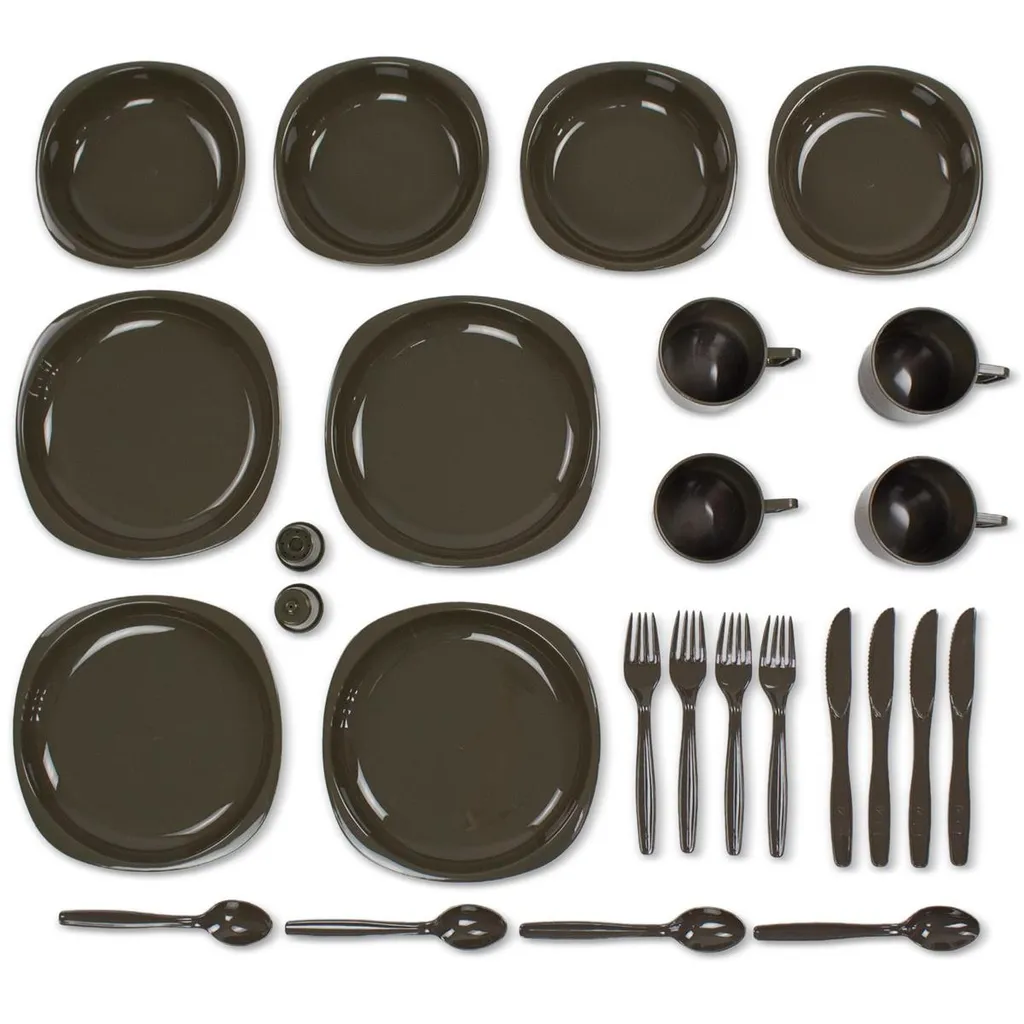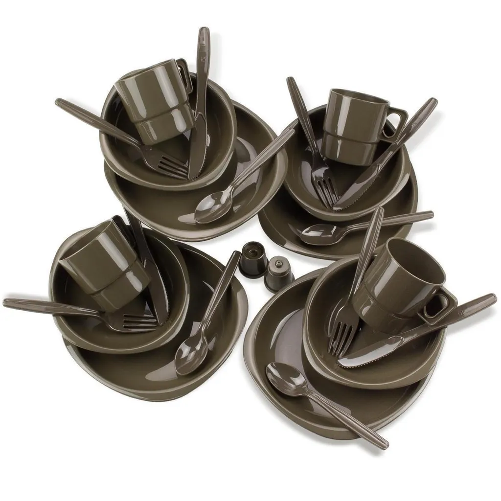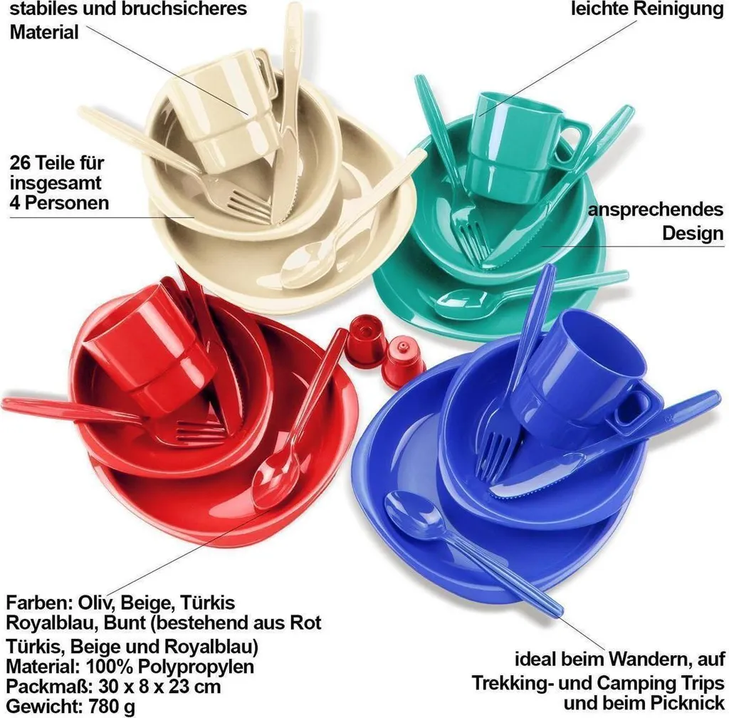 Das bruchfeste Geschirr eignet sich ideal für die Campingküche und es ist in diesem Set alles enthalten, was man für ein gemütliches Essen im Freien benötigt. Ob Sie sich für das Geschirr in Olivgrün, Beige, Türkis, Royal Blau oder für die bunte Version entscheiden, Sie haben mit diesem praktischen Geschirr die optimale Ergänzung zu Ihrer Campingausrüstung parat. Enthalten in dem umfangreichen Set sind je 4 Gabeln, 4 Messer, 4 Esslöffel, 4 Becher, 4 Teller und 4 Schüsseln. Ein Salzstreuer und ein Pfefferstreuer für das Nachwürzen bei Tisch dürfen hier natürlich auch nicht fehlen. Genießen Sie mit diesem stabilen Geschirr beispielsweise Ihre auf dem Grill zubereiteten Speisen und Ihren Morgenkaffee auf dem Campingplatz. Für eine platzsparende Aufbewahrung lässt es sich einfach stapeln.