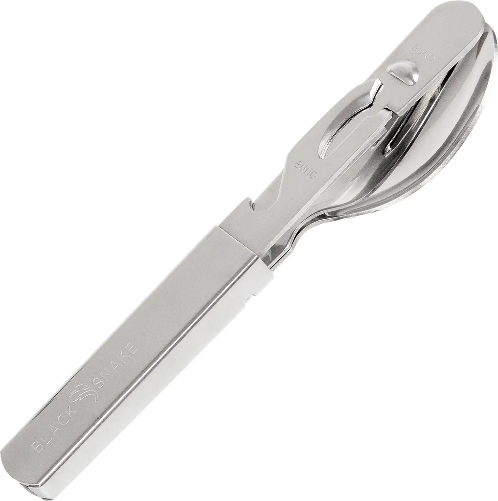 · kompakt zusammensteckbares Besteck bestehend aus Messer, Löffel, Gabel sowie Dosen- und Flaschenöffner