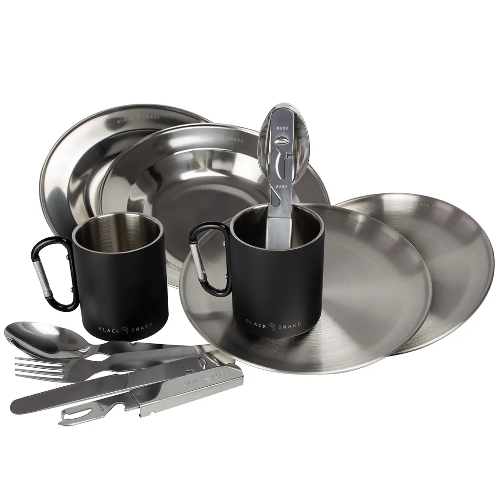 Die klassisch schönen und qualitativ hochwertigen Edelstahlteller sind abriebfest und nahezu unverwüstlich. Die gebürstete Oberfläche ist leicht zu reinigen. Aufgrund der Eigenschaften ist diese Art von Teller ideal geeignet für Camping-, Wander- oder Trekkingausflüge sowie weitere Outdooreinsätze. Eine tolle und nachhaltige Alternative zu Plastiktellern und durch die gute Größe der Essteller lassen sich viele Lieblingsgerichte beim Zelten & Co. gut genießen. Im Set enthalten sind die flache und die tiefe Variante sowie praktisches Campingbesteck plus doppelwandig isolierte Thermotasse. Das Besteck im Bundeswehr Stil ist für unterwegs kompakt zusammensteckbar. Die Tasse bietet einen Karabinerhaken Griff als praktisches Feature. Damit ist der bruchsichere Becher einfach an den Rucksack anzuhängen und ebenso perfekt für unterwegs.