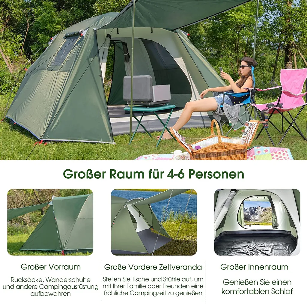 Der Innenraum des Campingzeltes misst 250 x 410 x 145 cm (L x B x H), kann 4 Erwachsene und 2 Kinder aufnehmen und bietet viel Platz für die Familie. Darüber hinaus gibt es einen großen Vorraum, in dem Rucksäcke, Wanderschuhe und andere Campingausrüstung bequem aufbewahrt werden können, und er kann auch ein Ruhebereich für Ihren lieben Hund sein.