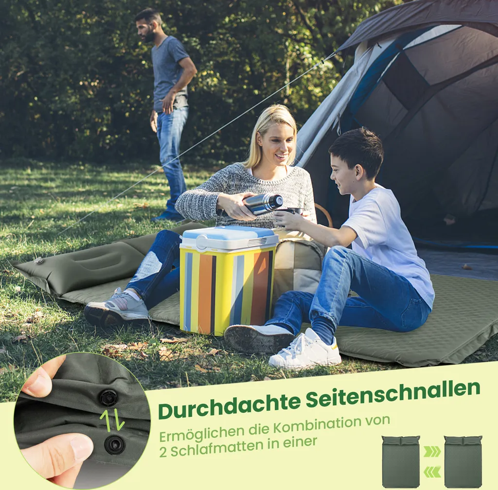 Diese Outdoor-Schlafmatte verfügt über 5 Knöpfe auf jeder Seite, die der Verbindung mit einer anderen Matte dienen, um eine extra große Fläche zu schaffen. Dieses flexible Kombination erhöht die Praktikabilität, sodass von mehreren Personen genutzt werden kann.