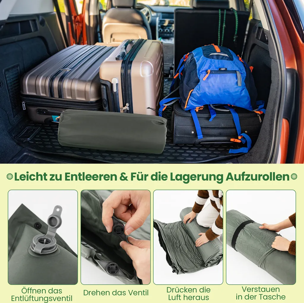 Durch das eingebaute selbstaufblasende System ist keine Pumpe für die Campingmatte erforderlich. Wenn Sie die Matte aufblasen möchten, drehen Sie einfach am Ventil. Rollen Sie die Matte auf, um die Luft schnell herauszulassen.