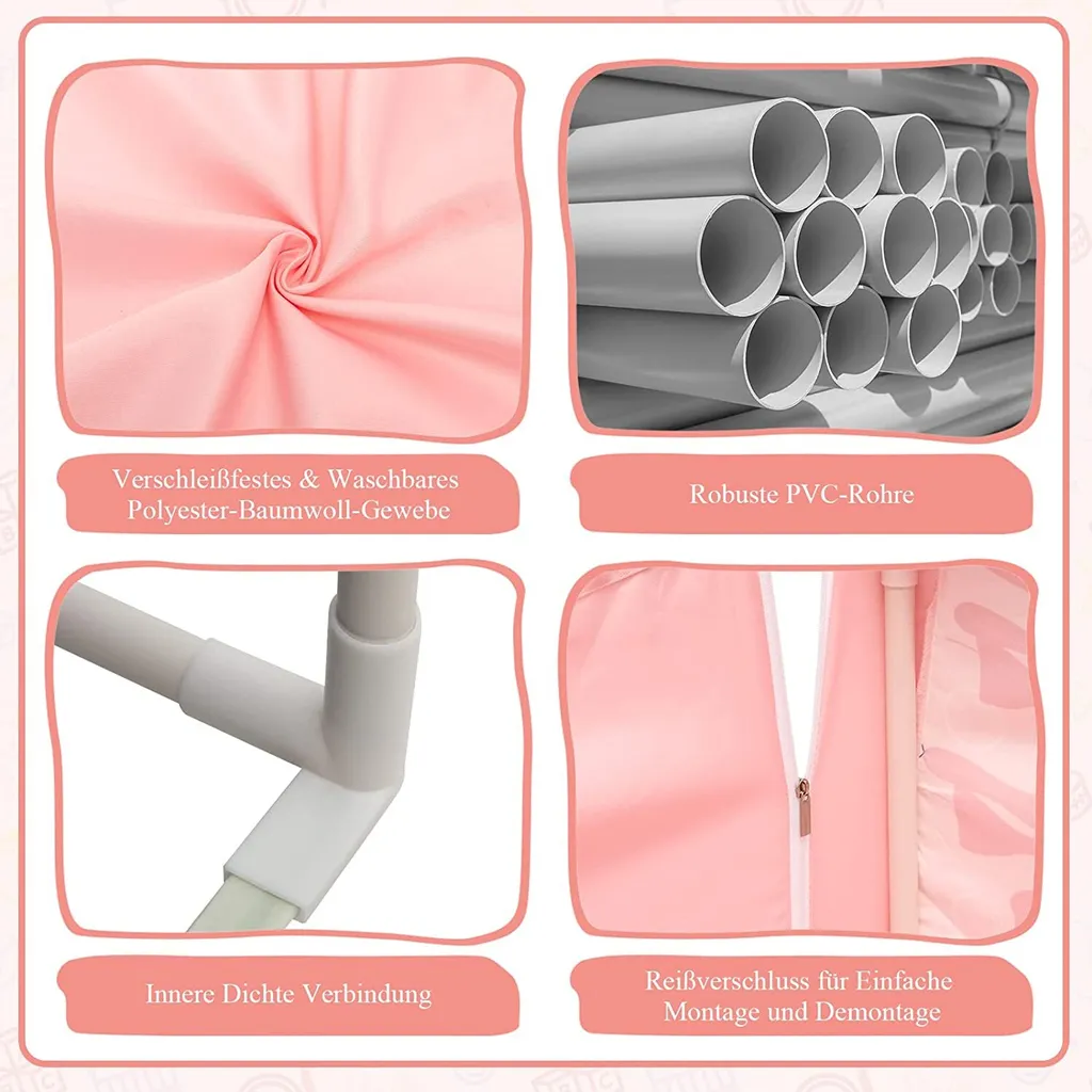 Dieses Spielzelt aus hochwertigem Polyester-Baumwollgewebe ist langlebig, verschleißfest und waschbar, was sich ideal für den Innenbereich eignet. Darüber hinaus bilden starke PVC-Rohre und innere dichte Verbindungsstücke einen soliden Rahmen, der ihm hilft, stabil auf dem Boden zu bleiben.