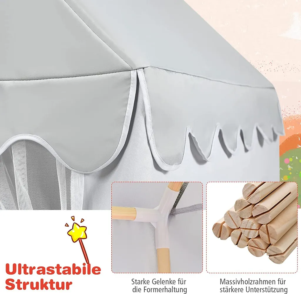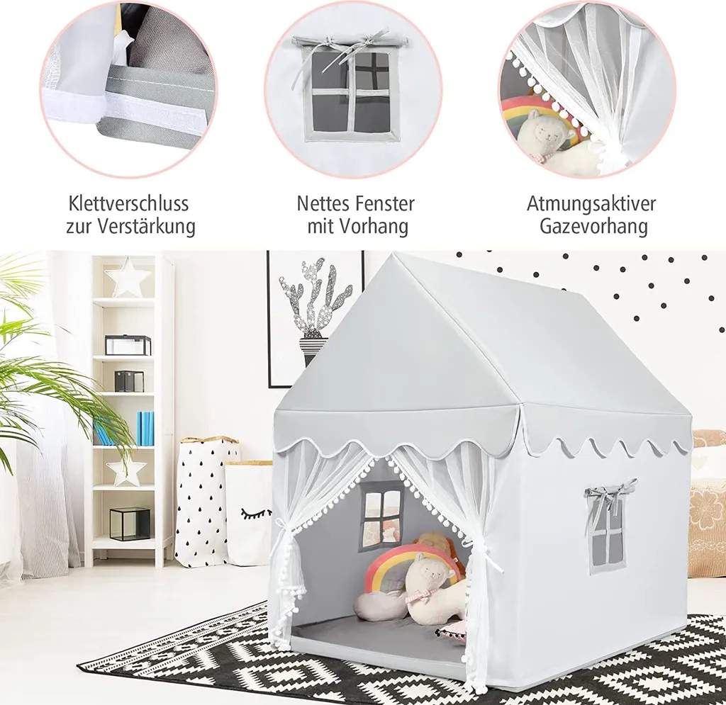 Genau wie ein echtes Haus ist dieses Spielhaus mit seinem Massivholzrahmen sehr stabil. Eine weiche und dicke Decke wird mitgeliefert, um ein superbequemes Sitzgefühl zu schaffen. Das ganze Haus ist mit ungiftigem und geruchlosem Oxford-Stoff bezogen, und Sie können sich darauf verlassen, dass Ihr Kind immer in einer sicheren Umgebung sein wird. Die bezaubernden Türen und Fenster dienen nicht nur der Dekoration, sondern auch der Luftzirkulation.