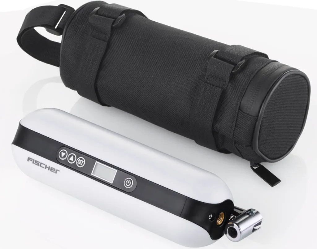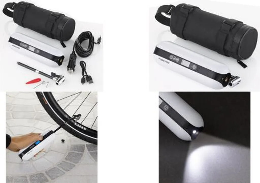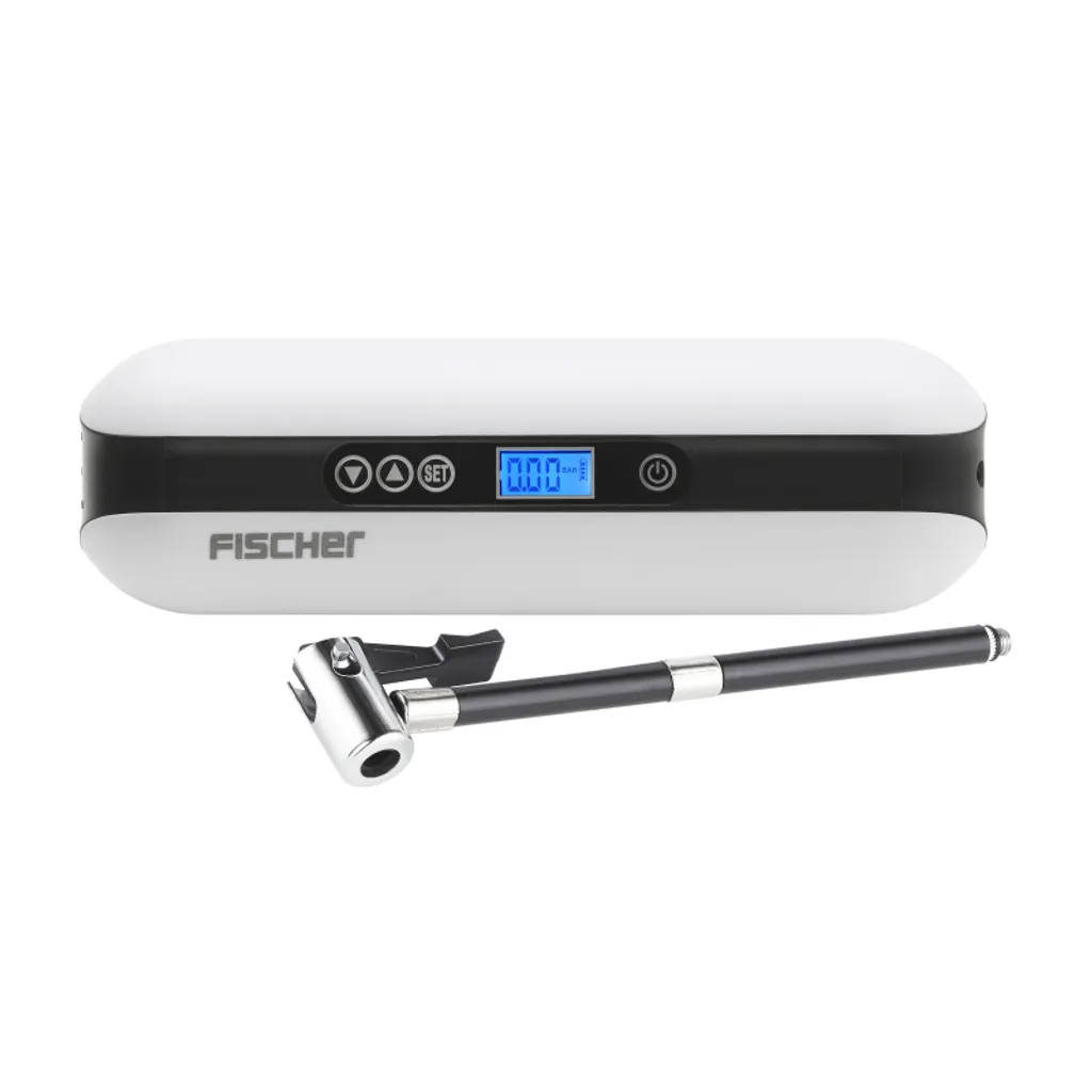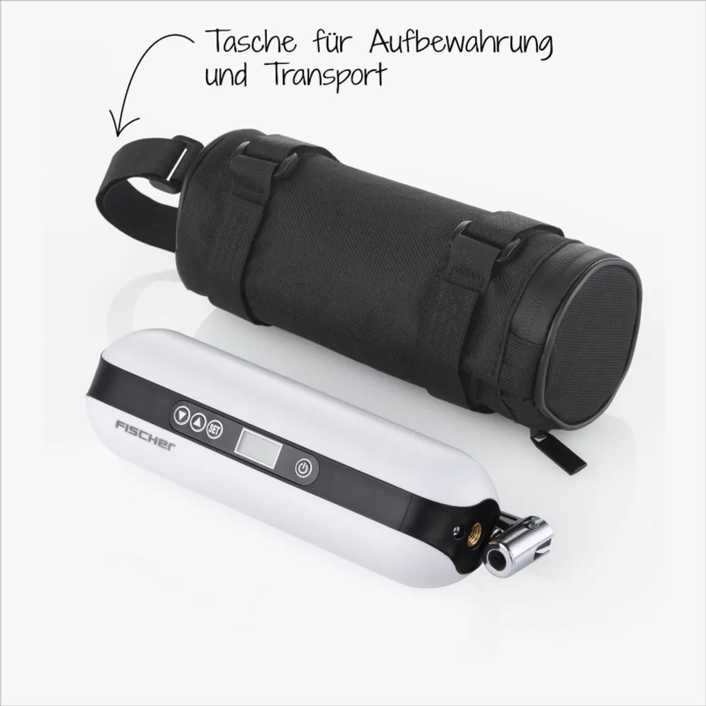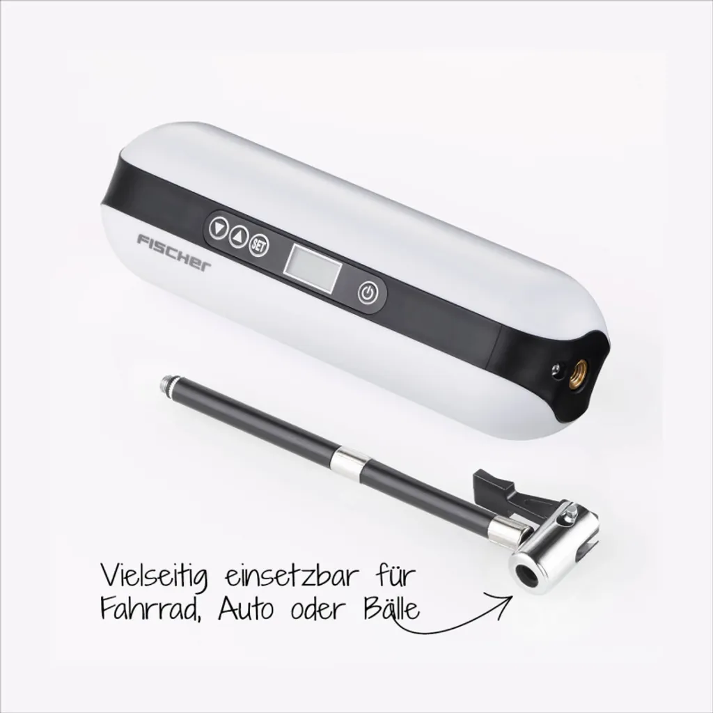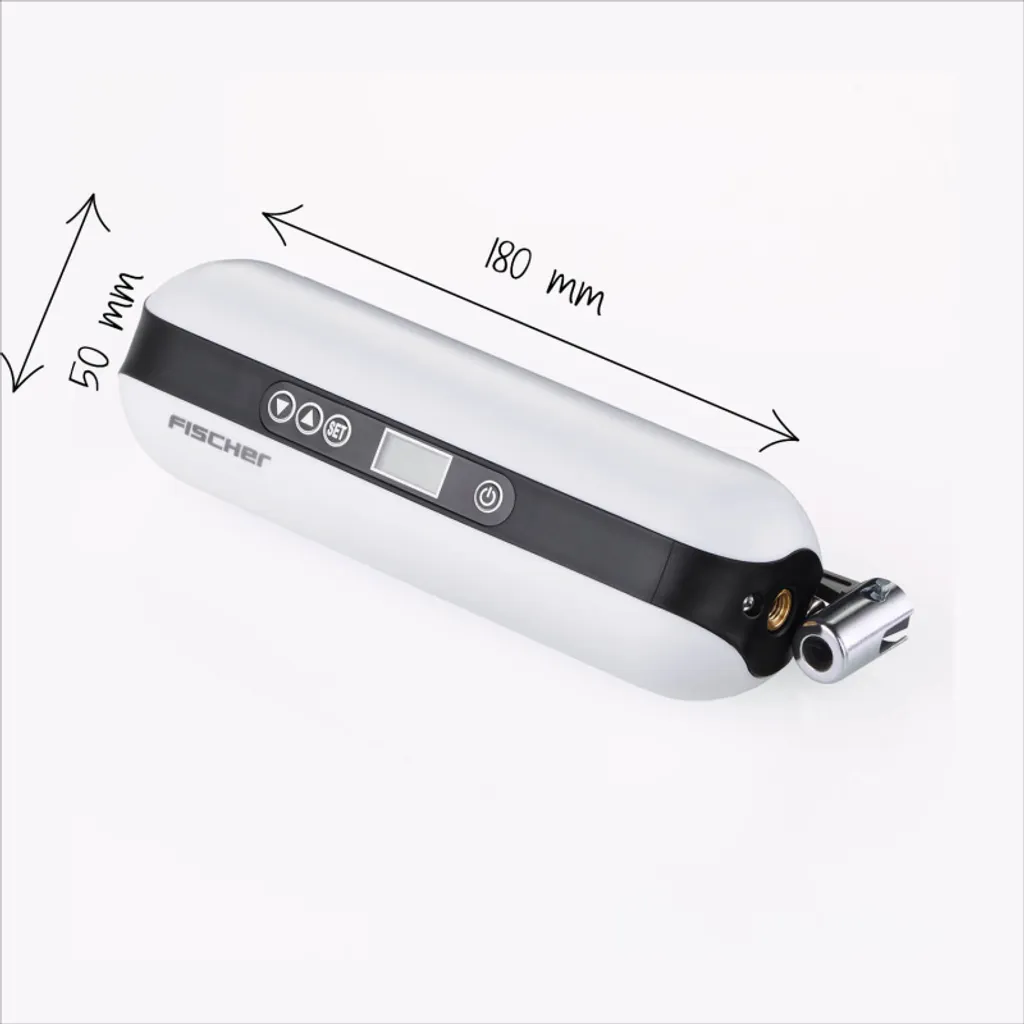 Einfacher war Luft pumpen noch nie. Der elektrische FISCHER Akku-Kompressor ist vielseitig einsetzbar: Fahrrad – oder E-Bike-Reifen, Fußball, Basketball, Schwimmring und sogar Autoreifen lassen sich damit problemlos und sicher mit Luft befüllen. Zusätzlich findet er Verwendung als Taschenlampe. Lassen Sie den FISCHER Akku-Kompressor einfach für sich arbeiten und ersparen Sie sich das meist kraftkostende Pumpen. Der Kompressor wird dafür mit einer Fülle an Zubehör geliefert: Adapter für Sclaverand-und Dunlopventile, Adapter für Luftmatratzen, Ballnadel, USB Ladekabel, Ladekabel für Zigarettenanzünder, Tasche zur Aufbewahrung und Transport. Der Kompressor verfügt über eine große Batteriekapazität, ein Fahrradreifen kann zum Beispiel bis zu 8 Mal aufgepumpt werden. Das Gerät lässt sich leicht transportieren, um auch unterwegs schnell Luft auf die Reifen zu pumpen. Das beleuchtete Display zeigt Ihnen auch bei Dunkelheit die notwendigen Angaben, wie Luftdruck oder Batterieladestand an. Mittels eines Adapters kann der Kompressor sogar als Powerbank fungieren (Adapter nicht im Ladeumfang enthalten). Das macht ihn zu einem universell einsetzbaren Gerät in Haus, Garten und bei Freizeitaktivitäten. Mit nur 336gr Gesamtgewicht ist der Akku-Kompressor auch ideal zum Mitnehmen.