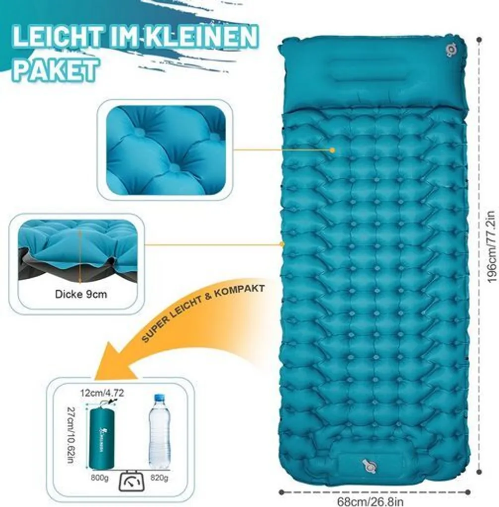 - 9 cm Dick Super Luftmatratze mit Kissen: Im Vergleich zu anderen Luftmatratzen ist unsere Camping Isomatte 9 cm dick und wird mit einem 18 cm einem einteiligen Kissen, um Ihren Nacken zu stützen und Körper von hartem Boden fernzuhalten. Das maximale Gewicht es tragen kann beträgt 200 kg.