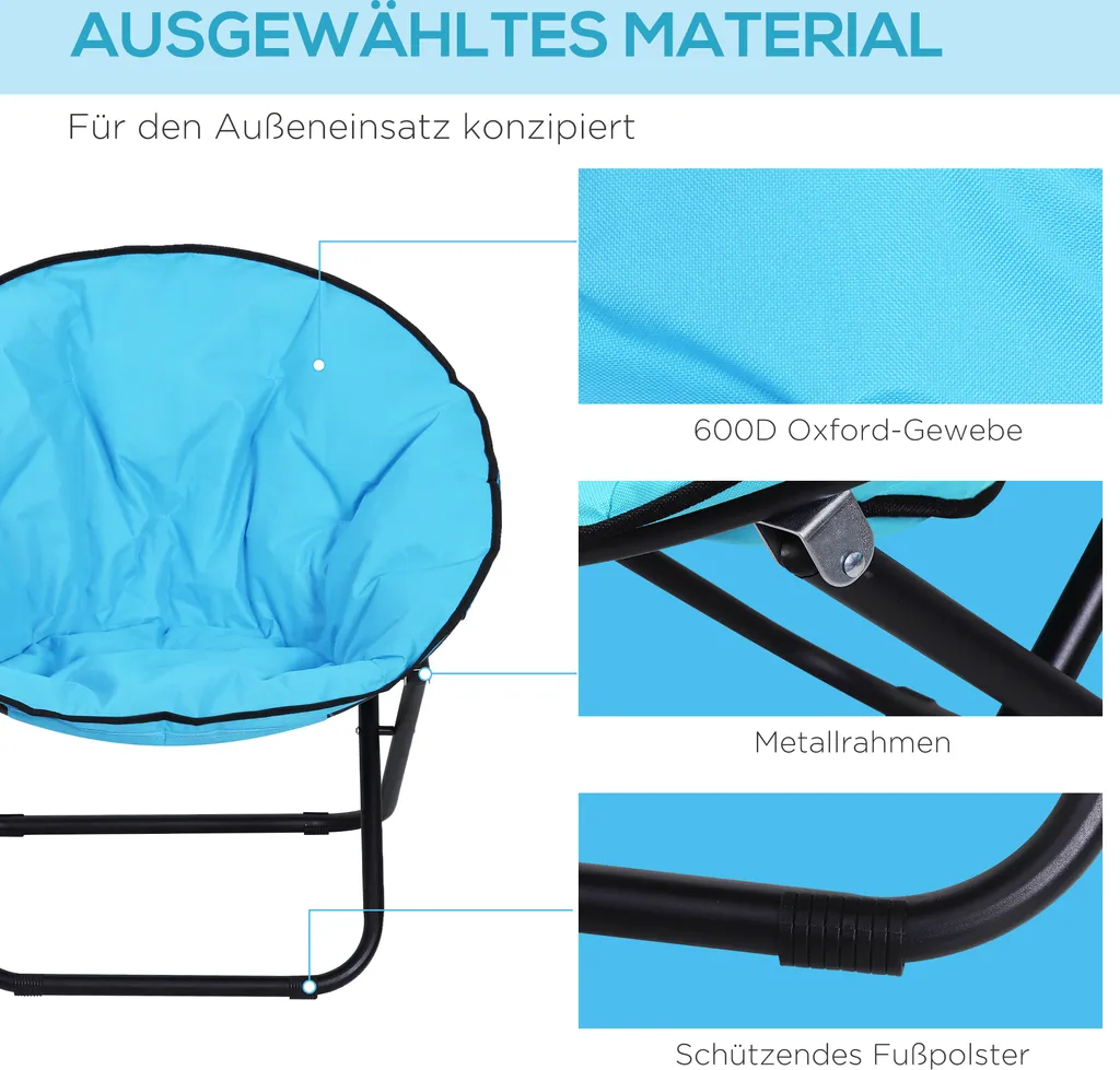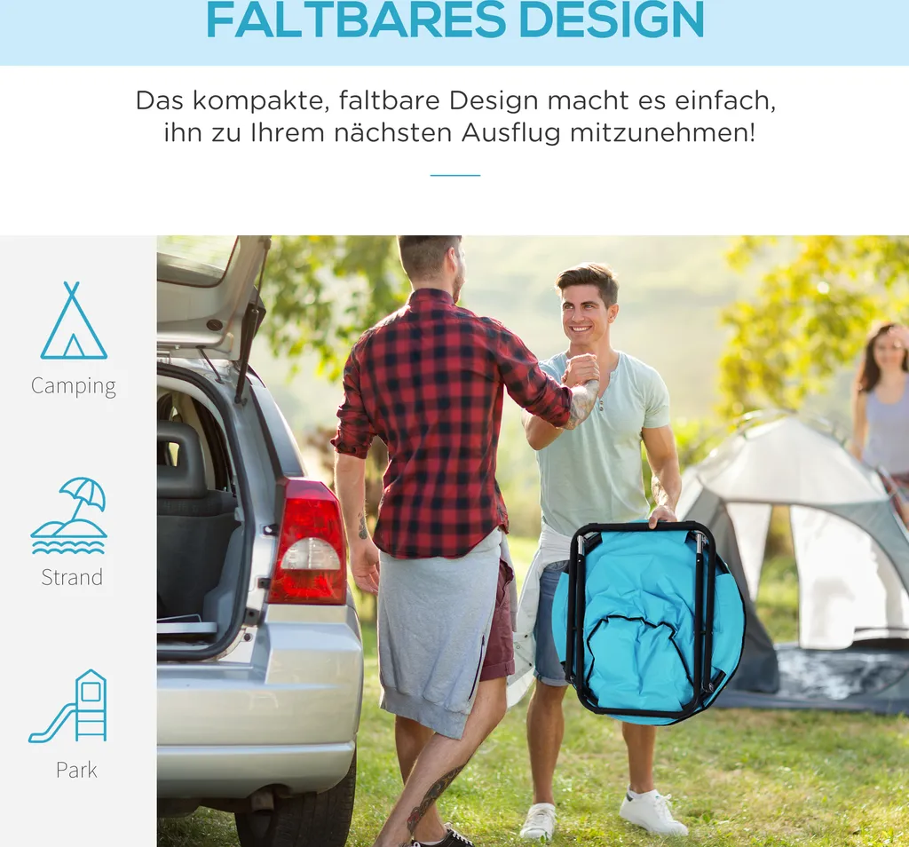 Dieser gemütliche Klappsessel ist sowohl für den Gebrauch im Innen- als auch im Außenbereich geeignet. Durch sein geringes Gewicht und kleines Klappmaß lässt er sich bequem transportieren und bietet Ihnen bei Ihren Outdoor-Aktivitäten einen bequemen Ort zum Sitzen und Entspannen. Der pflegeleichte 600D-Oxfordstoff, der robuste Metallrahmen und die großzügige Polsterung machen diesen Klappsessel zum perfekten Begleiter für Groß und Klein, ganz egal wo!