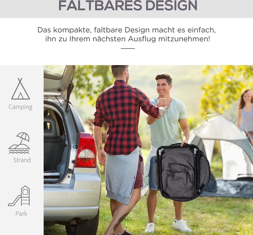 Dieser gemütliche Klappsessel ist sowohl für den Gebrauch im Innen- als auch im Außenbereich geeignet. Durch sein geringes Gewicht und kleines Klappmaß lässt er sich bequem transportieren und bietet Ihnen bei Ihren Outdoor-Aktivitäten einen bequemen Ort zum Sitzen und Entspannen. Der pflegeleichte 600D-Oxfordstoff, der robuste Metallrahmen und die großzügige Polsterung machen diesen Klappsessel zum perfekten Begleiter für Groß und Klein, ganz egal wo!
