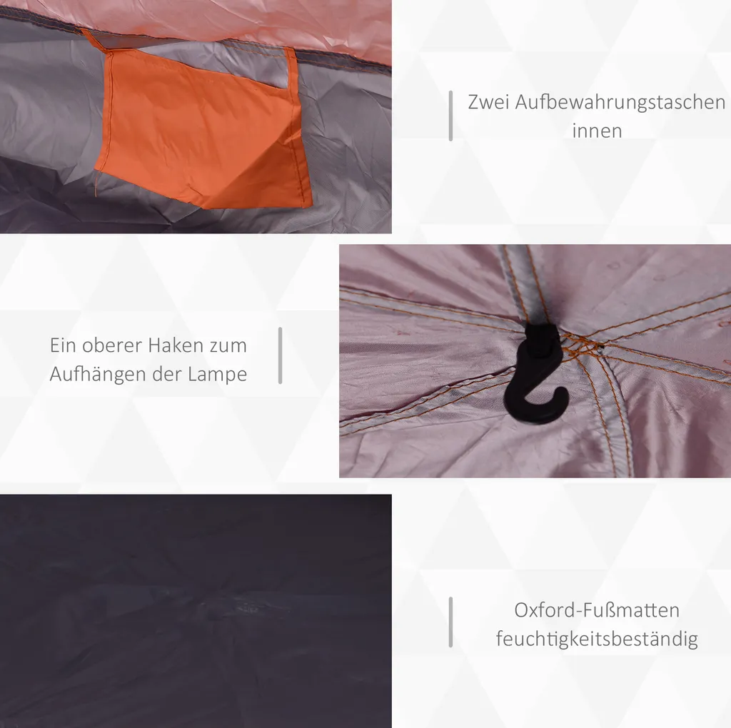 · Lieferumfang: 1 x Zelt, 6 x Abspannseile, 12 x Heringe, 1 x Aufbauanleitung, 1 x Tragetasche
