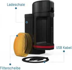 Die Lieferung erfolgt im Set mit Ladestation zur Wandmontage (inkl. Dübel und Schrauben), USB-Kabel und orangener Farbfilterscheibe.