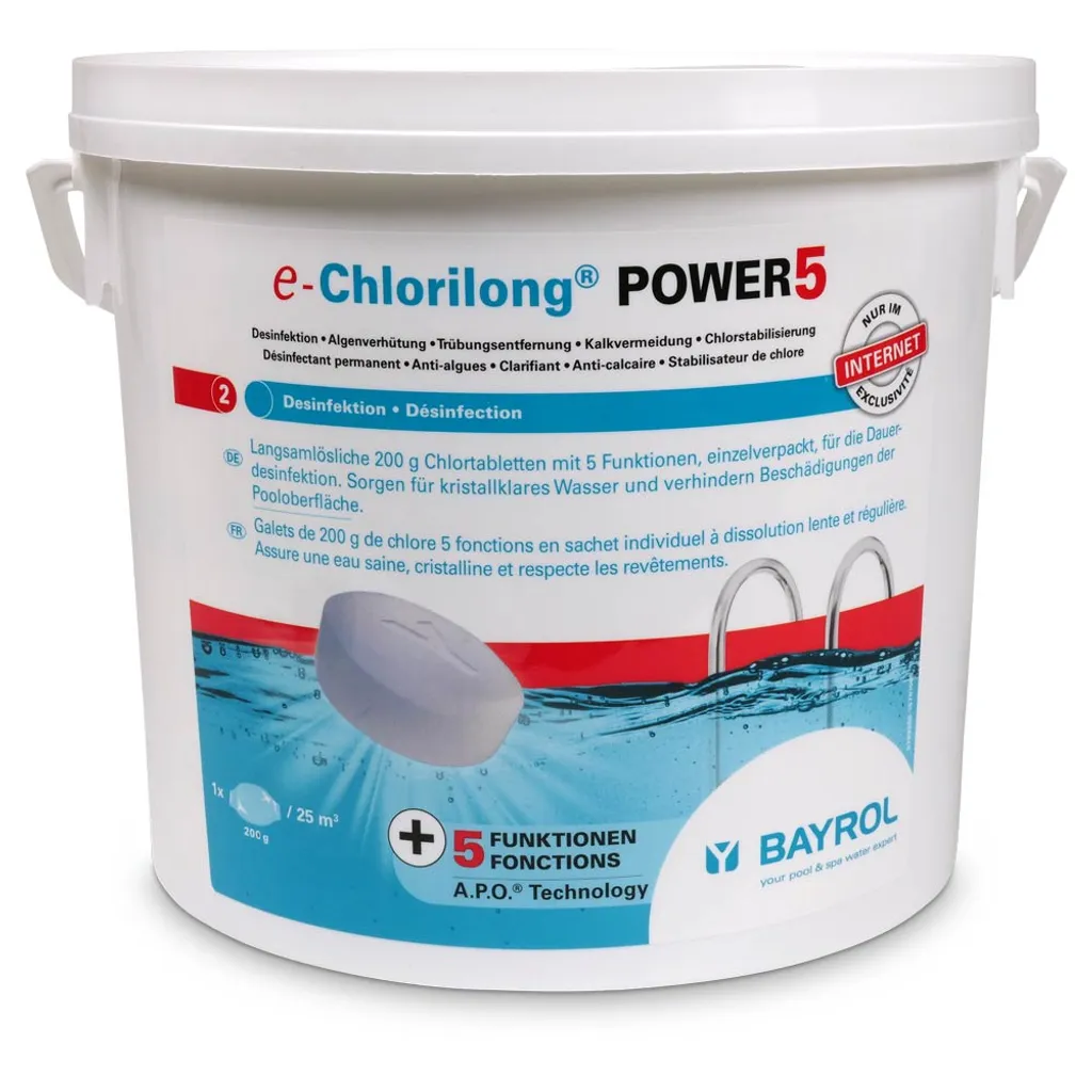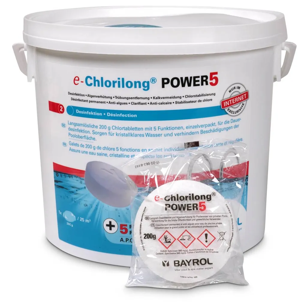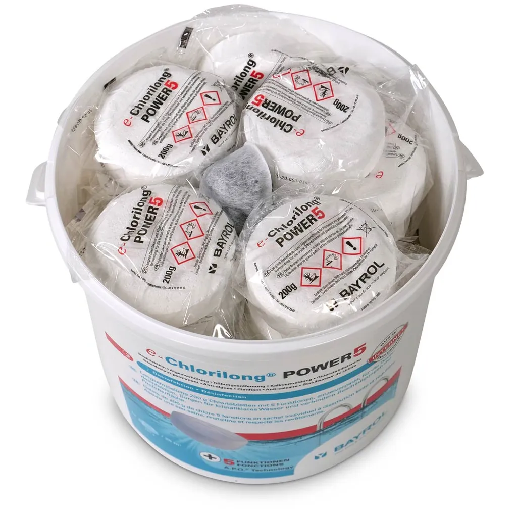 Mit Bayrol e-Chlorilong POWER 5 haben Sie ein Premium Wasserpflegemittel mit 5-fach-Funktion! – Desinfektion – Algenverhütung – Trübungsentfernung – Kalkvermeidung – ChlorstabilisierungDie 200-g-Tabletten pflegen ohne weiteren Aufwand rundum Ihr Schwimmbecken und bieten eine dauerhafte Desinfektion Ihres Schwimmbeckens. Bayrol nutzt hierfür eine spezielle A.P.O. Bayrol e-Chlorilong POWER 5 bekämpft Bakterien, Pilze, Viren und Trübstoffe und enthält Flockungsmittel für glasklares Wasser und einen Chlorstabilisator gegen einen schnellen Abbau von Chlor. Es ist sowohl kalkfrei als auch pH-neutral und der Einsatz ist bei allen Wasserhärten möglich.Die im Liefergebinde enthaltene Clorodor Control® Kapsel verringert den unangenehmen Chlorgeruch im Eimer, sodass die Lagerung umso angenehmer wird. Anwendung: – Prüfen und korrigieren Sie den korrekten pH-Wert (zwischen 7,0 – 7,4) – Eine e-Chlorilong POWER 5-Tablette je 25 m³ Wasserinhalt für ca. 0,5-1,0 mg/L bzw.Das Markenversprechen lautet: Bayrol® bietet Ihnen die beste Lösung für die Pool- und Whirlpool-Wasserpflege. Hinweise: – Geben Sie die Tabletten aufgrund von möglichen Bleichflecken nicht direkt ins Becken – Kann die Atemwege reizen – Gesundheitsschädlich bei Verschlucken – Verursacht schwere Augenreizung/-schäden – Sehr giftig für Wasserorganismen mit langfristiger Wirkung – Entwickelt bei Berührung mit Säure giftige Gase – Nicht zusammen mit anderen Produkten verwenden, da gefährliche Gase (Chlor) freigesetzt werden können – Beachten Sie immer die Gefahren- und Sicherheitshinweise auf dem Etikett