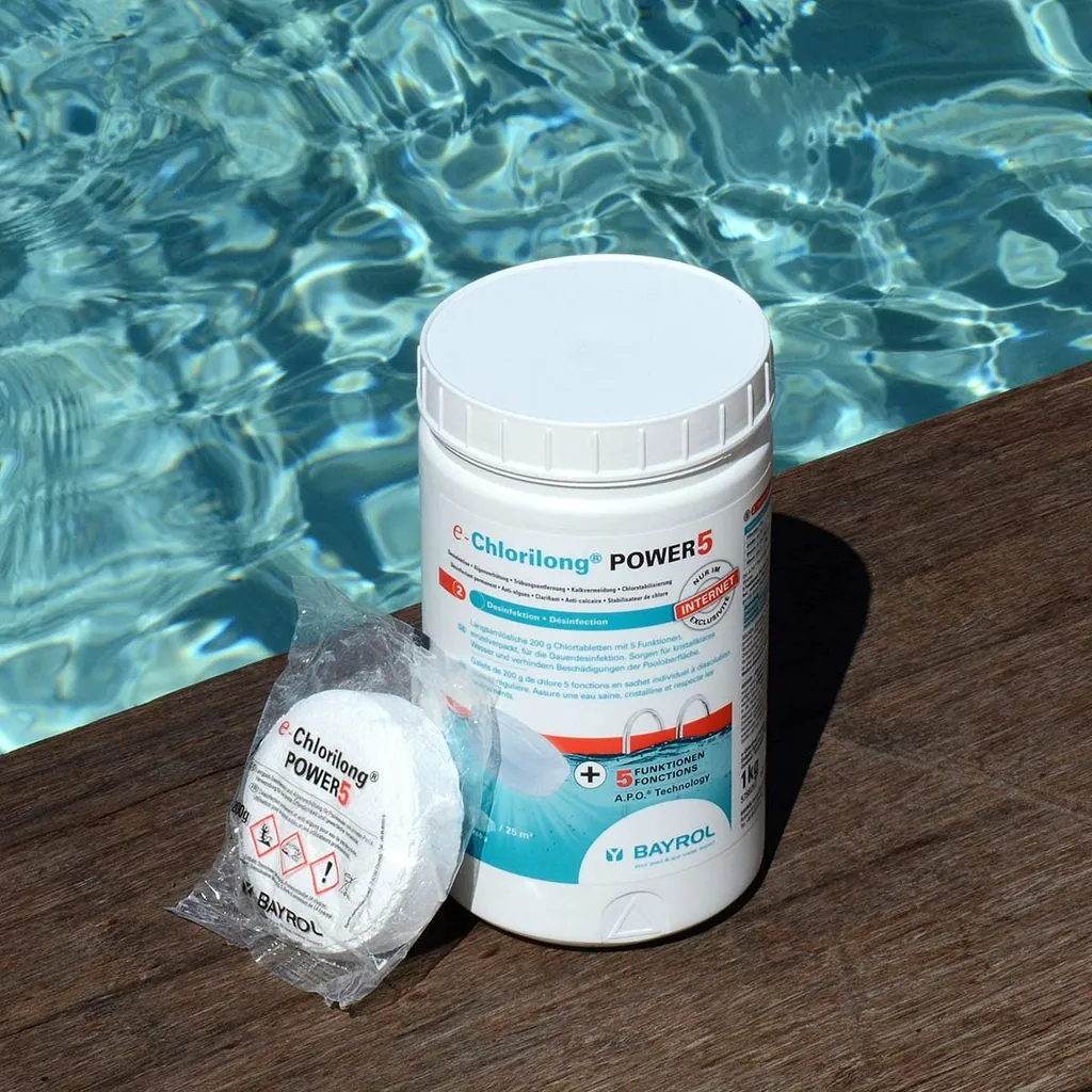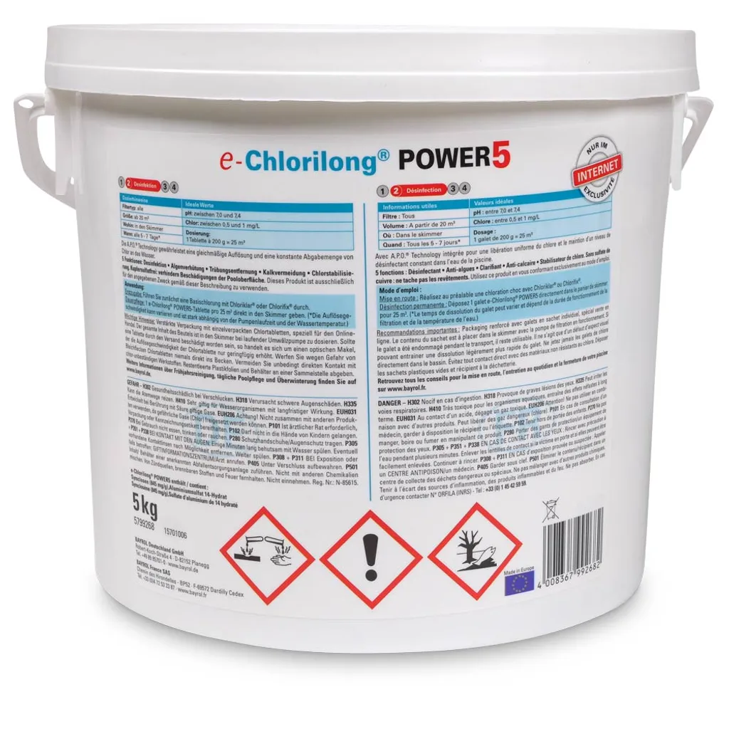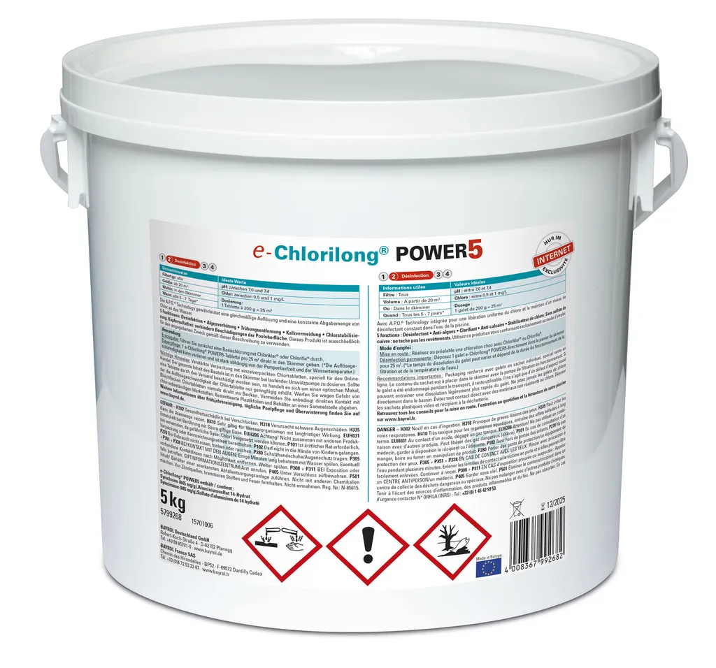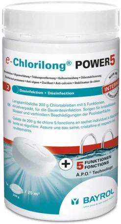 Mit Bayrol e-Chlorilong POWER 5 haben Sie ein Premium Wasserpflegemittel mit 5-fach-Funktion! – Desinfektion – Algenverhütung – Trübungsentfernung – Kalkvermeidung – ChlorstabilisierungDie 200-g-Tabletten pflegen ohne weiteren Aufwand rundum Ihr Schwimmbecken und bieten eine dauerhafte Desinfektion Ihres Schwimmbeckens. Bayrol nutzt hierfür eine spezielle A.P.O. Bayrol e-Chlorilong POWER 5 bekämpft Bakterien, Pilze, Viren und Trübstoffe und enthält Flockungsmittel für glasklares Wasser und einen Chlorstabilisator gegen einen schnellen Abbau von Chlor. Es ist sowohl kalkfrei als auch pH-neutral und der Einsatz ist bei allen Wasserhärten möglich.Die im Liefergebinde enthaltene Clorodor Control® Kapsel verringert den unangenehmen Chlorgeruch im Eimer, sodass die Lagerung umso angenehmer wird. Anwendung: – Prüfen und korrigieren Sie den korrekten pH-Wert (zwischen 7,0 – 7,4) – Eine e-Chlorilong POWER 5-Tablette je 25 m³ Wasserinhalt für ca. 0,5-1,0 mg/L bzw.Das Markenversprechen lautet: Bayrol® bietet Ihnen die beste Lösung für die Pool- und Whirlpool-Wasserpflege. Hinweise: – Geben Sie die Tabletten aufgrund von möglichen Bleichflecken nicht direkt ins Becken – Kann die Atemwege reizen – Gesundheitsschädlich bei Verschlucken – Verursacht schwere Augenreizung/-schäden – Sehr giftig für Wasserorganismen mit langfristiger Wirkung – Entwickelt bei Berührung mit Säure giftige Gase – Nicht zusammen mit anderen Produkten verwenden, da gefährliche Gase (Chlor) freigesetzt werden können – Beachten Sie immer die Gefahren- und Sicherheitshinweise auf dem Etikett