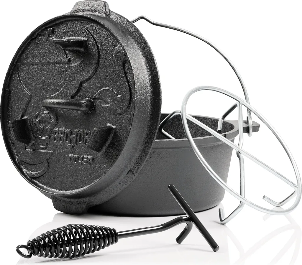 Der Dutch Oven ist ein schwerer, traditioneller, gusseiserner Topf und ein exakt passender Deckel mit dem man überall kochen, braten, schmoren, frittieren, dünsten und backen kann. Der Dutch Oven reguliert dank seiner hohen Masse (Gusseisen) ungleichmäßige Hitze und ermöglicht so ein gleichmäßiges Garen. Einfach glühende Kohlen, Glut oder Grillbriketts auf den Deckel und unter den Topf geben und das Dutch Oven-Erlebnis kann losgehen. Der extra erhöhte Deckelrand und der Untersetzer bieten optimale Bedingungen für Kohle und Co.