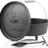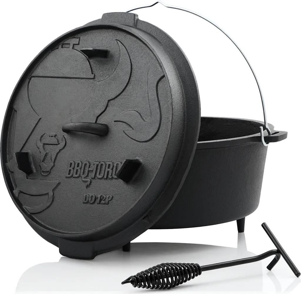 Der Dutch Oven ist ein schwerer, traditioneller, gusseiserner Topf und ein exakt passender Deckel mit dem man überall kochen, braten, schmoren, frittieren, dünsten und backen kann. Der Dutch Oven reguliert dank seiner hohen Masse (Gusseisen) ungleichmäßige Hitze und ermöglicht so ein gleichmäßiges Garen. Einfach glühende Kohlen, Glut oder Grillbriketts auf den Deckel und unter den Topf geben und das Dutch Oven-Erlebnis kann losgehen. Der extra erhöhte Deckelrand und die drei Beine bieten optimale Bedingungen für Kohle und Co.