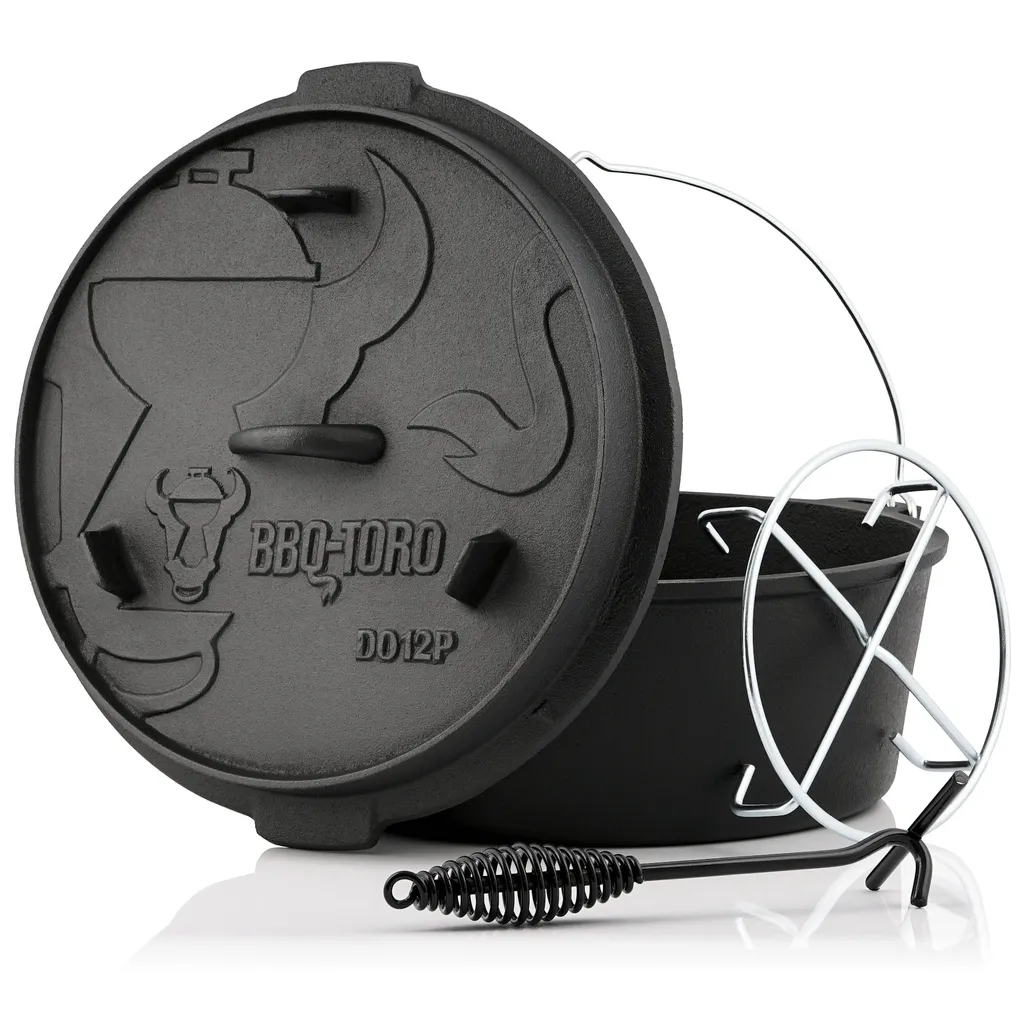 Der Dutch Oven ist ein schwerer, traditioneller, gusseiserner Topf und ein exakt passender Deckel mit dem man überall kochen, braten, schmoren, frittieren, dünsten und backen kann. Der Dutch Oven reguliert dank seiner hohen Masse (Gusseisen) ungleichmäßige Hitze und ermöglicht so ein gleichmäßiges Garen. Einfach glühende Kohlen, Glut oder Grillbriketts auf den Deckel und unter den Topf geben und das Dutch Oven-Erlebnis kann losgehen. Der extra erhöhte Deckelrand und die drei Beine bieten optimale Bedingungen für Kohle und Co.
