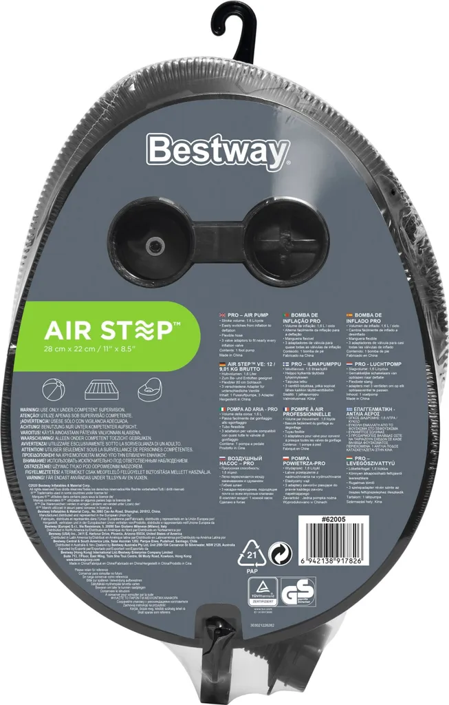 Die 28 cm große Bestway® Air Step™ Fußpumpe ermöglicht ein schnelles Aufpumpen und Entleeren von Schwimmringen, Luftmatratzen, Schlauchbooten, Spielzeug sowie vieler weiterer Aufblasartikel. Die für einen maximalen Luftdurchsatz konzipierte Pumpe hat ein Hubvolumen von 1,6 Liter und bietet so einen kontinuierlichen Luftstrom. Der Wechsel zwischen Auf- und Abpumpen ist denkbar einfach. Zudem sind im Lieferumfang werden drei Universal-Ventiladapter enthalten, welche mit nahezu allen Aufblasventilen kompatibel sind, so dass Sie eine Vielzahl von Aufblasartikeln mit der gleichen Pumpe aufpumpen können! Dank des kompakten Designs ist die Bestway® Air Step™ Fußpumpe der ideale Begleiter auf Reisen.