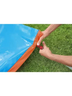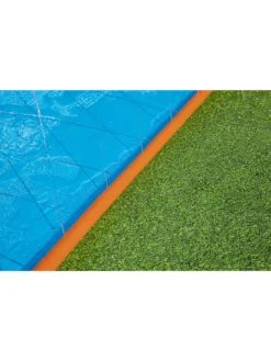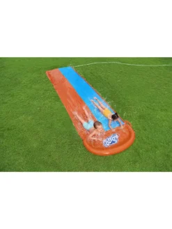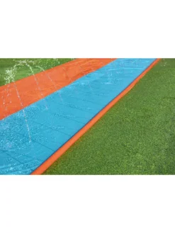 Die Doppelwasserrutsche Bestway H2OGO! hat eine Länge von 4,88 Metern. Mit der Doppelrutsche könnt ihr gegeneinander antreten. Wer zuerst das Sprühbecken am Ende der Bestway-Wasserrutsche erreicht, hat gewonnen! Die Wasserrutsche kann einfach an den Gartenschlauch angeschlossen werden.