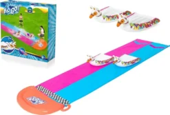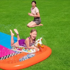 Mit dem Bestway H2OGO! Bei der doppelten Wasserrutsche Lama Rama rasen Sie mit Ihrem eigenen Lama ins Ziel! Das farbenfrohe, aufblasbare Lama dient als Boogie-Board und sorgt für noch mehr Spaß beim Rennen auf der 4,88 Meter langen Wasserrutsche. Die eingebauten Sprinkler der Bestway Lama Race Wasserrutsche sorgen für eine durchgehend glatte Bahn und eine frische Dusche im Ziel.