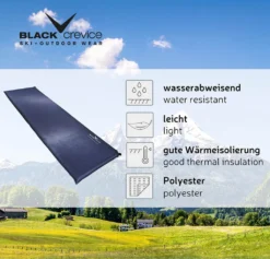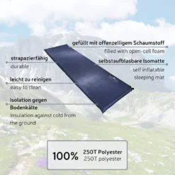 Durch ihre Größe von 200 x 66 cm ist sie für alle Körpergrößen bestens geeignet. Das Material der Matte ist Nylon 250T Polyester, sie ist sehr strapazierfähig, wasserabweisend und leicht zu reinigen. Die Matte ist rutschfest und isoliert hervorragend gegen Feuchtigkeit und Kälte.