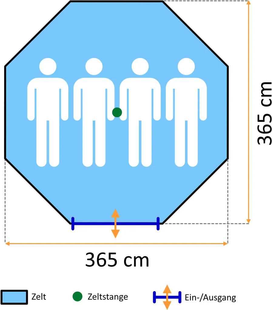 – Außenmaß: ca. (L) 365 cm x (B) 365 cm x (H) 250 cm