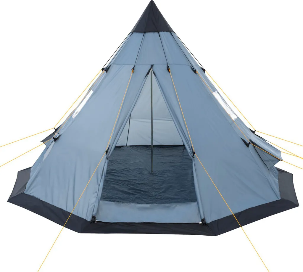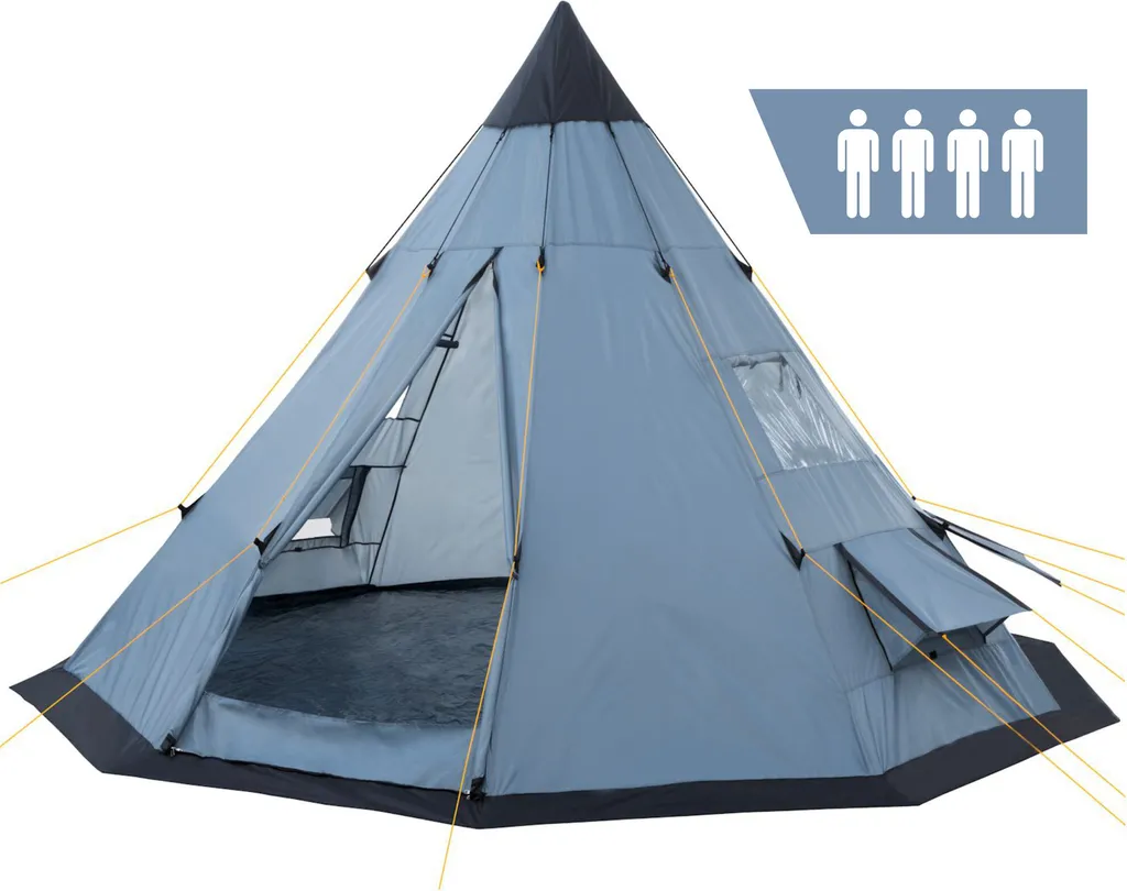 Das Tipi Zelt ist ideal für 4 Personen und bietet eine optimale Stehhöhe. Dies ist ein für jedes Wetter und 4 Jahreszeiten geeignetes Firstzelt.