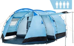 Das Tunnelzelt bietet mit seinen großen 410 x 260 x 150 cm genügend Platz für 4 Personen. Der Zeltstoff ist aus 190T Polyester und hat zusätzlich eine PolyurethanBeschichtung. Mit einer Wassersäule von 3000 mm schützt Sie der Zeltstoff ideal vor Regenschauern. Der Boden ist aus PE-Folie gefertigt. Mit einem Packmaß von 64 x 19 cm und einem Gewicht von ca. 7,9 kg ist das Zelt handlich zu transportieren. Das Zelt wird, in einer Tasche gepackt, geliefert. Desweiteren liegen dem Lieferumfang: Fiberglasgestänge, Aufstellstangen, Erdnägel und Abspannseile bei.