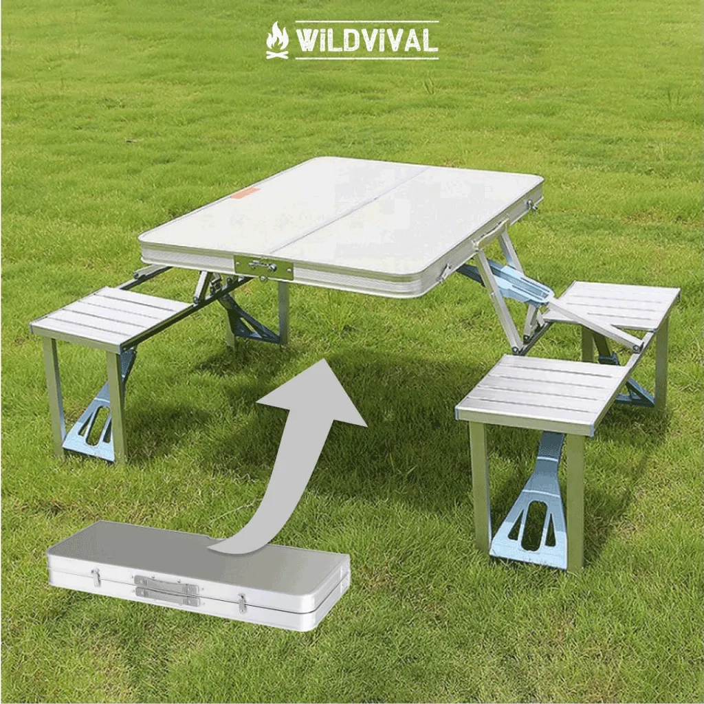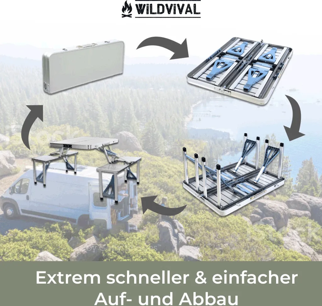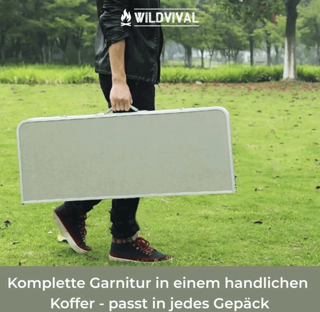Ein kompletter Camping-Tisch mit vier Sitzplätzen in einem kleinen handlichen Koffer