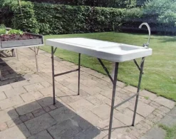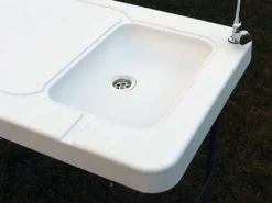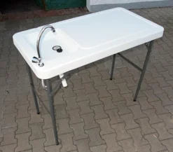 Stabiler Tisch mit Kunststoffspüle, Abfluss und Wasserhahn