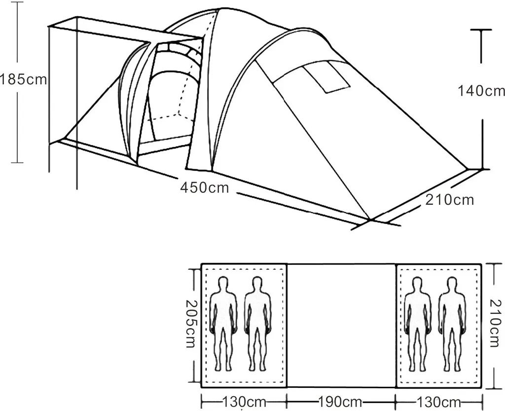 Außenmaße mit aufgestelltem Vorzeltbereich (HxBxT): 185 x 450 x 210 cm