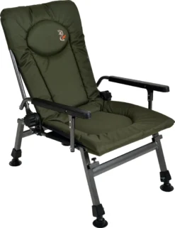 Der F5R-Sessel ist ein Touristen- und Angelsessel mit gummibeschichteten Armlehnen und einer verstellbaren Rückenlehne. Das Modell ist mit einem System ausgestattet, mit dem die Fußstütze befestigt werden kann. Jedes Bein ist individuell verstellbar, was es in unebenem oder abfallendem Gelände großartig macht. Es endet mit einem breiten Fuß, der verhindert, dass es auf einem sumpfigen oder weichen Boden zusammenbricht.