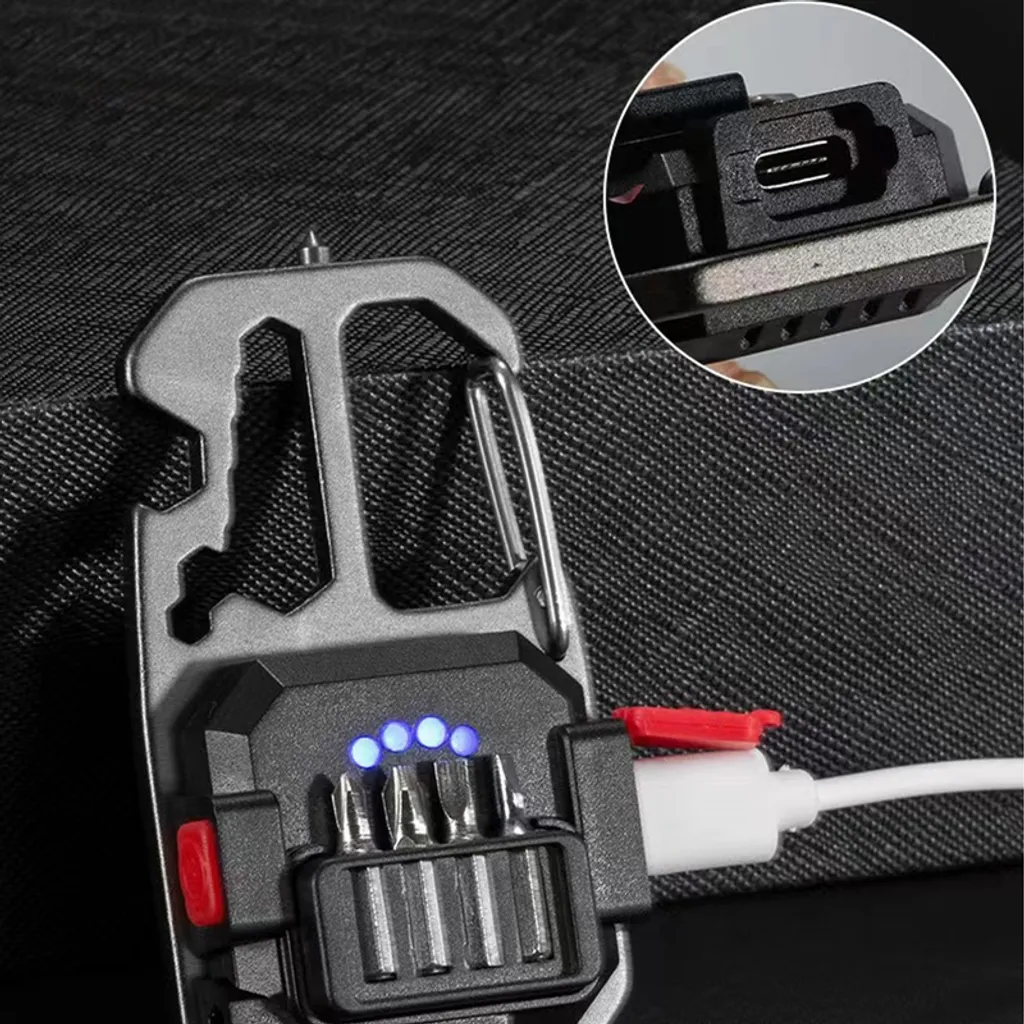 Funktion: zerbrochener Fensterhammer, Flaschenöffner, Haken, Schraubenschlüssel. Typ-C-Aufladung, Leistungsanzeige, Stativloch