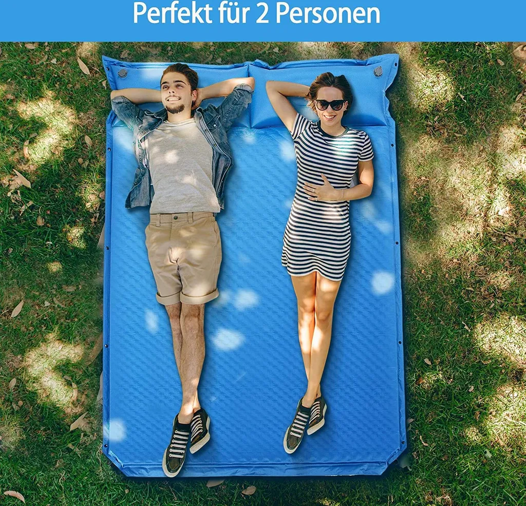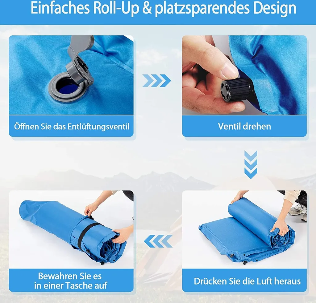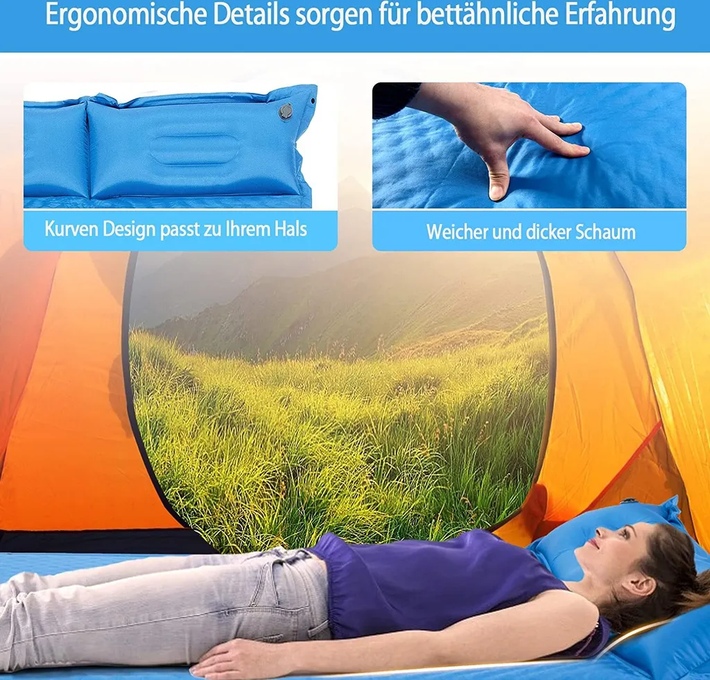 Diese Campingmatte verfügt über ein fortschrittliches selbstaufblasendes System. Nach dem Aufblasen ist sie dick, weich und bietet ultimativen Komfort und ein wunderbares Schlaferlebnis. Die kompakte Größe macht sieeinfach zu tragen, was ideal für Camping, Wandern, Reisen, Übernachtungspartys und andere Outdoor-Aktivitäten ist. Die wasserdichte Oberfläche ist für feuchte Bedingungen ausgelegt, sodass Sie an jedem beliebigen Ort schlafen können.