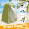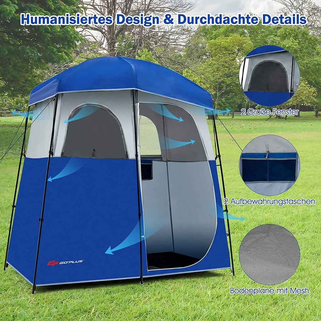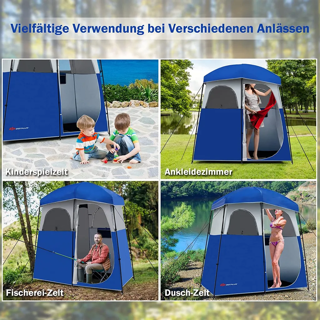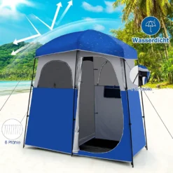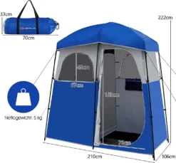 Unser privates Zelt hat eine Tür in der Mitte welches den Innenbereich in zwei separate Räume aufteilt, die gleichzeitig genutzt werden können, einer zum Duschen und der andere zum Umziehen. Das Zelt hat eine Kapazität von 210 cm x 106 cm x 222 cm, ausreichend für 2 Erwachsene und Ideal als Ankleideraum, Duschzelt, Spielzelt für Kinder oder allgemein als Campingzelt.
