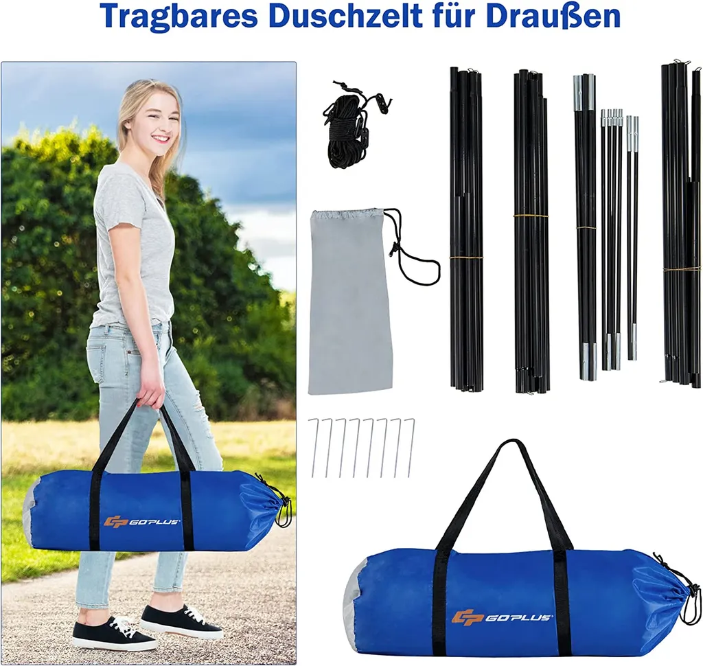 Mehrzweck-Duschzelt entspricht ihren Bedürfnissen! Haben Sie das Verlangen nach einer Dusche oder einer Möglichkeit, sich umzuziehen, aber machen sich Gedanken über ihre Privatsphäre, wenn Sie im Freien Camping? Mit unserem privaten Duschzelt können Sie diese Probleme schnell lösen. Die Privatkabine bietet zwei Fenster, die bei Bedarf für gute Belüftung geöffnet, oder zur Sicherung der Privatsphäre geschlossen werden können. Im Inneren des Zeltes teilt eine große Tür mit Reißverschluss den Innenraum in 2 separate Bereiche, Einen zum Duschen, den anderen zum Umziehen. Beide Räume beinhalten eine Aufbewahrungstasche für Toilettenartikel und Klamotten. Eine schwarze Bodenplatte in Gitterform erleichtert die Entwässerung nach dem Duschen.