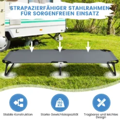 Dieses Klappbett ist ideal für den Außen- und Innenbereich, perfekt für Camping, Wandern, Angeln, Strand, Terrasse, Pool, Rasen, Garten oder Büro. Und dieses Schlafbett für Erwachsene kann auch als Sonnenliege zum Sonnenbaden, temporäres Gästebett oder Bürobett verwendet werden. Sie können für mehr Komfort auch ein Kissen auf das Campingbett legen.
