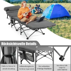 All-in-One s faltbares Campingbett! Unser klappbares Feldbett besteht aus atmungsaktivem und verschleißfestem Oxford-Stoff, der Sie länger begleiten kann. Darüber hinaus bieten wir auch eine herausnehmbare Matratze aus Hirschledervlies an, der hautfreundliche weiche Stoff sorgt für mehr Komfort. Im heißen Sommer können Sie die Matratze für ein atmungsaktiveres und kühleres Erlebnis entfernen. Außerdem wird Ihr Nacken durch das geneigte Design des Bettkopfes und des zusätzlichen Kissens nicht steif. Jedes Stützbein wird mit Fußabdeckungen geliefert, um ein Verrutschen des Bettrahmens zu verhindern. Und das Bettgestell kann zusammengeklappt und in unserer Tragetasche verstaut werden, was es zu einer großartigen Wahl für Outdoor-Reisen, Camping oder Wandern macht!