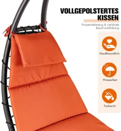 Möchten Sie sich im Garten entspannen? Mit unserem Liegestuhl können Sie es sich gutgehen lassen. Das sanfte Schaukeln wirkt besonders entspannend. Außerdem vermindert der geschwungene Rahmen den Druck auf Lenden und Wirbelsäule. Aus Polyester und Baumwolle gefertigt bieten Ihnen die Polsterung und Kopfstütze einen besonders hohen Komfort. Der rostbeständige Stahlrahmen und Kippschutz ermöglichen eine hohe Stabilität, Robustheit und Tragkraft von 150 kg. Zudem schützt Sie das Vordach vor der Sonne. Über den Knopf lässt es sich leicht anpassen und auch abnehmen. Dank der detaillierten Anleitung und dem mitgelieferten Zubehör ist der Aufbau einfach. Mit den Bändern lässt sich die Polsterung fest am Rahmen fixieren. Unser Stuhl ist eine perfekte Ergänzung für Terrassen, Veranden, Gärten, Balkone, Pools, etc.