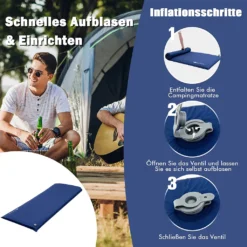 Unsere Isomatte verwendet ein automatisches Aufblasdesign, um Ihre Hände zu befreien und Zeit zu sparen. Sie verfügt über ein Aufblasventil, das eine Pumpe überflüssig macht. Sie müssen nur das Ventil drehen, um die Matte in 3-5 Minuten mit Luft zu füllen, um eine dicke Schlafmatte zu erhalten, und die Luft ablassen, indem Sie die Campingmatratze aufrollen.