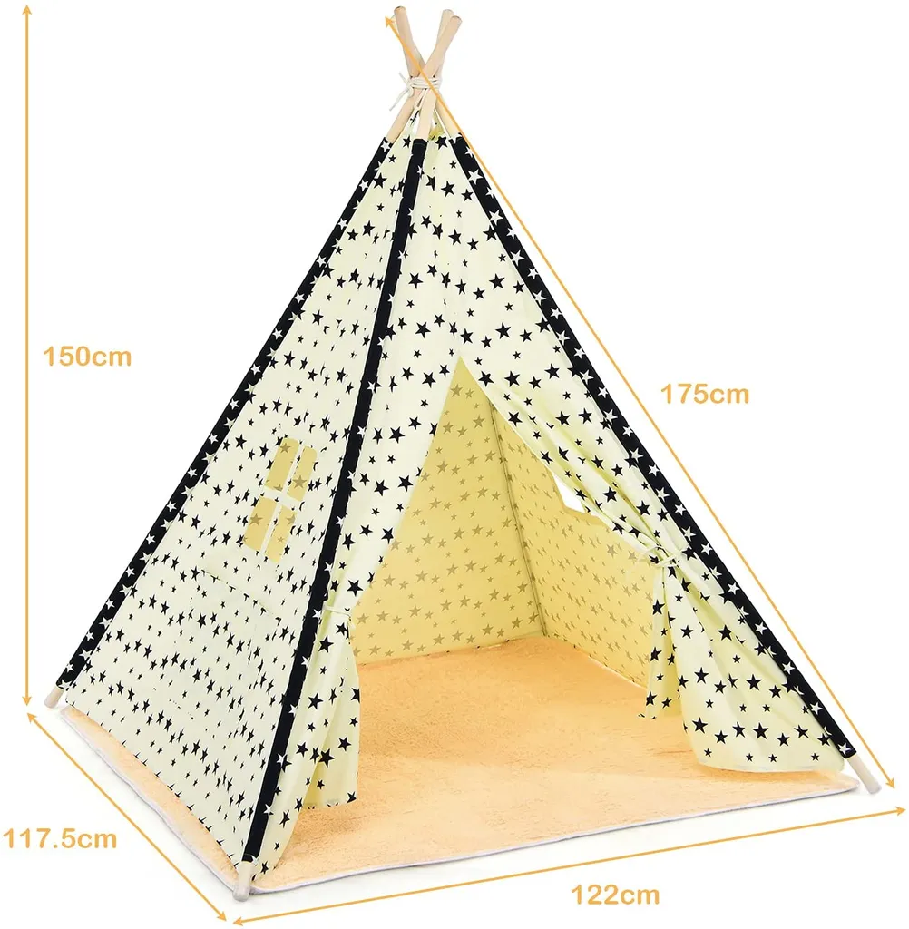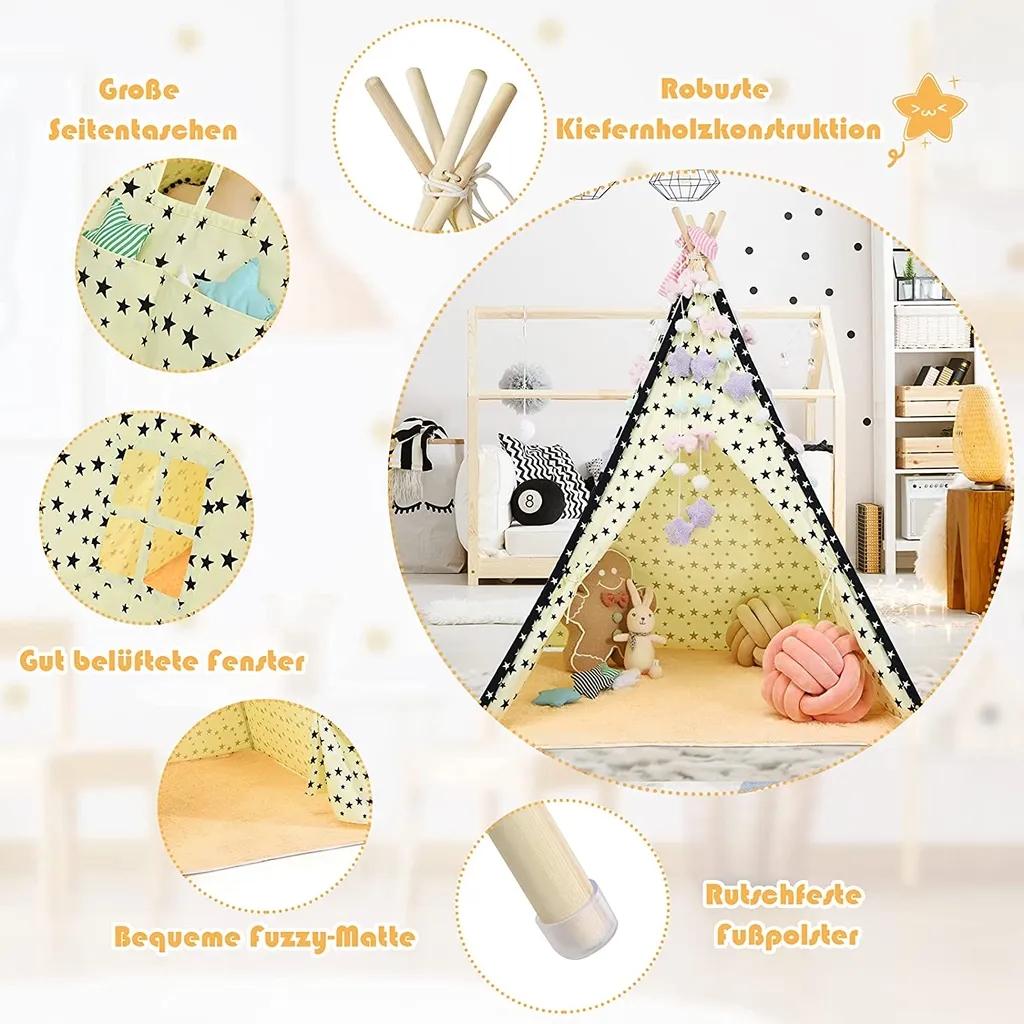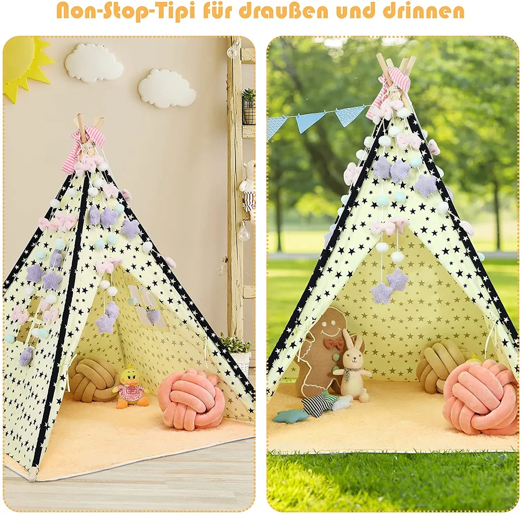 Mit diesem hübschen Spielzelt haben Kinder viel Spaß. Durch die schönen Farben und hübschen Muster wird es ihnen mit Sicherheit gefallen. Das Tipi besteht aus natürlicher Baumwolle und festem Kiefernholz für eine hohe Sicherheit. Die Stangen mit rutschfesten Untersetzern sind fest miteinander verbunden, somit können Kinder bedenkenlos darin spielen. Zudem ist die große, weiche Bodenmatte ideal zum Schlafen und Lesen. Durch das geräumige Innere können auch mehrere Kinder miteinander spielen. So werden unvergessliche Kindheitserinnerungen geschaffen.