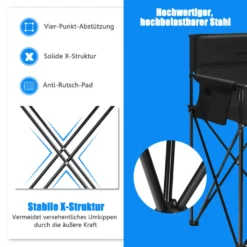 Dieser Campingstuhl ist die perfekte Wahl für Außenbereiche. Durch den robusten Stahl und hochwertigen Oxford-Stoff widersteht er Regen und Sonne. Im Beutel rechts kann das Handy oder Getränk verstaut werden. Er passt wunderbar in den Kofferraum und kann daher leicht überallhin transportiert werden. Daher ist er die perfekte Ergänzung fürs Campen, Angeln, Picknicken usw.