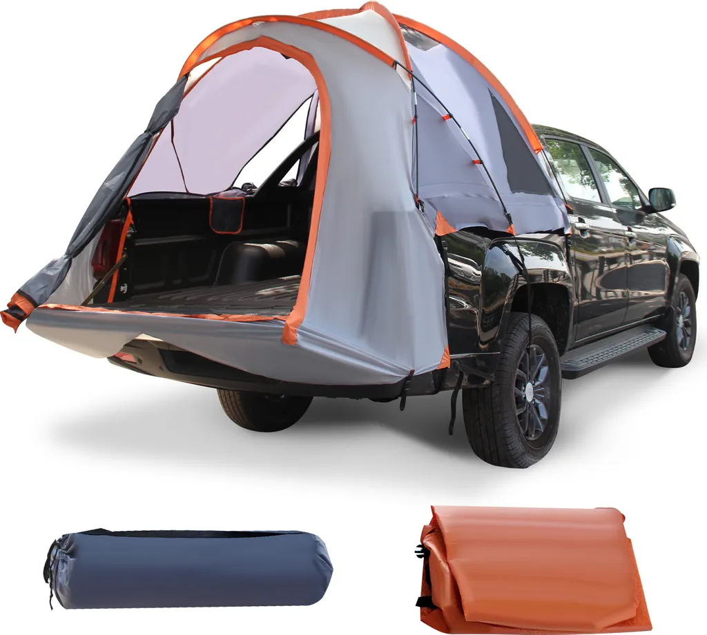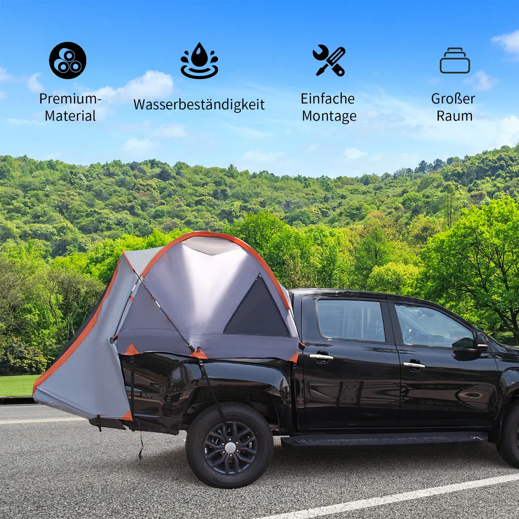 Camping auf Reisen mit unserem Pickup-Truck-Zelt! Wenn Sie nach einem Truck-Zelt suchen, ist unser Produkt die perfekte Wahl. Der Rahmen des Zelts besteht aus starken und flexiblen Glasfaserstangen für eine einfache Montage, und das Truck-Zelt kann einfach mit Schnallen an der Rückseite des Trucks befestigt werden, sodass Sie schnell ein stabiles Truck-Zelt erhalten, das Sie während Ihrer gesamten Reise begleitet. Und das Zelttuch besteht aus hochwertigem Polyestertaft, der eine gute Wasserdichtigkeit aufweist und Ihnen an Regentagen einen guten Schutz bietet. Das Zelt verfügt über ein abnehmbares Oberteil, das Sie für gute Sicht und Belüftung an sonnigen Tagen abnehmen können. Im Inneren des Zeltes gibt es viel Platz für 2-3 Personen zum Ausruhen oder Bewegen. Und es gibt eine doppelseitige Tür mit Reißverschluss für einfachen Zugang.