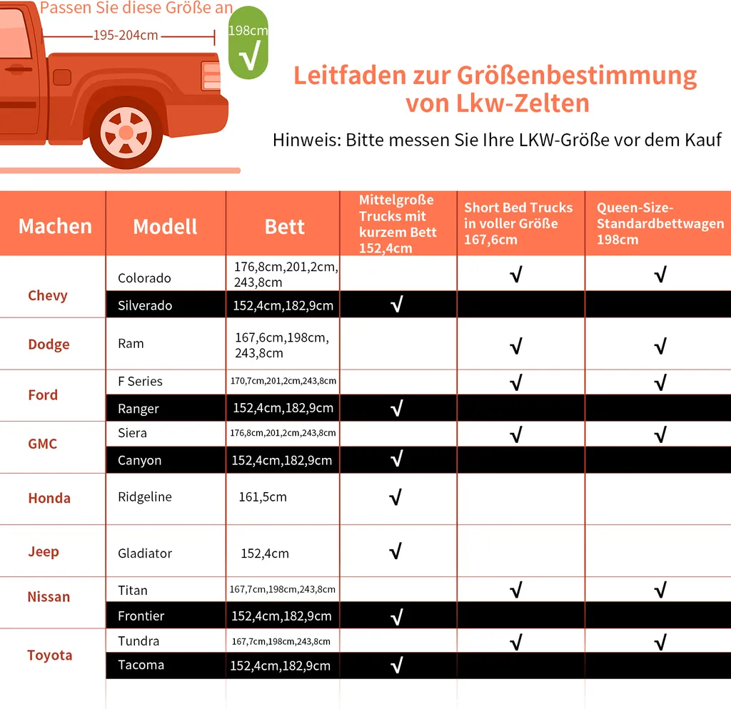 Unser Pickup-Truck-Zelt besteht aus hochwertigem Polyester-Taft, der wasserdicht, verschleißfest und robust ist. Der Rahmen des Zeltes wird von Glasfaserstangen getragen, die leicht für eine einfache Bewegung und korrosionsbeständig für eine lange Lebensdauer sind.