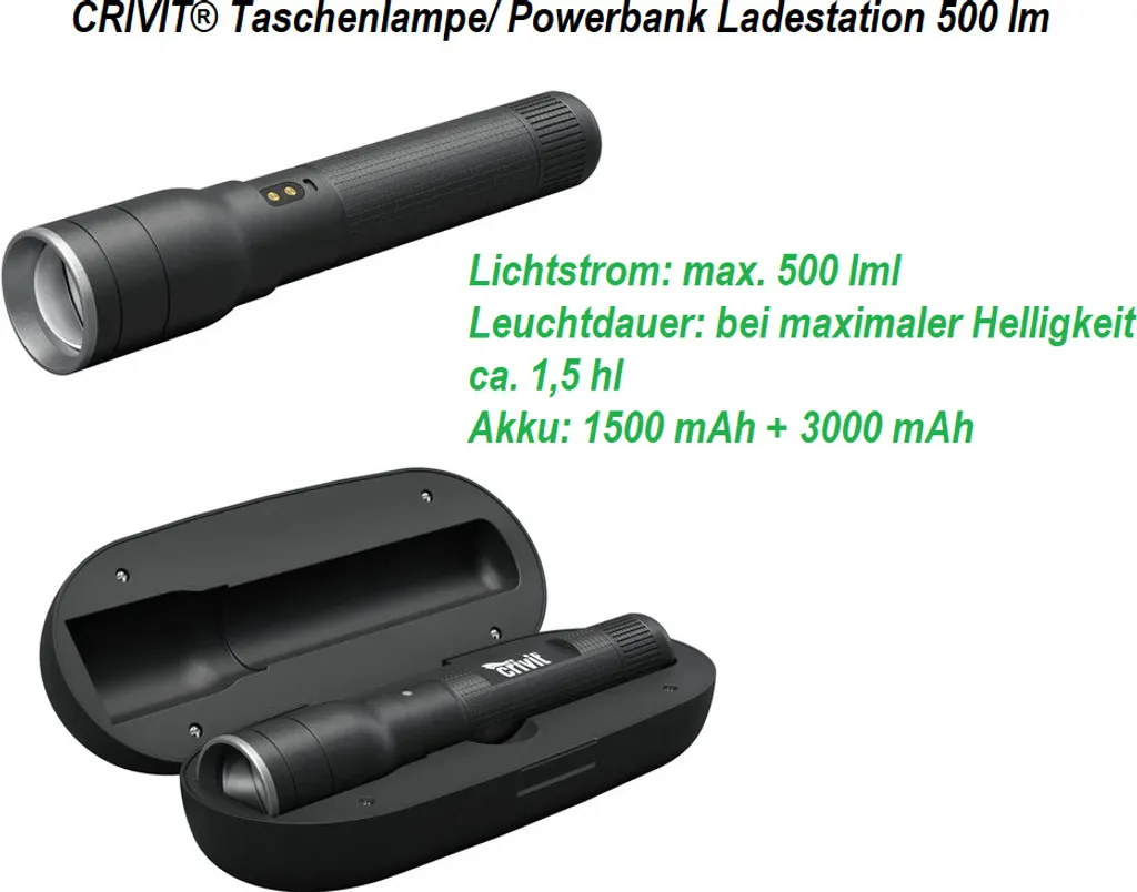 AKKU-TASCHENLAMPE MIT POWERBANK-LADESTATION
