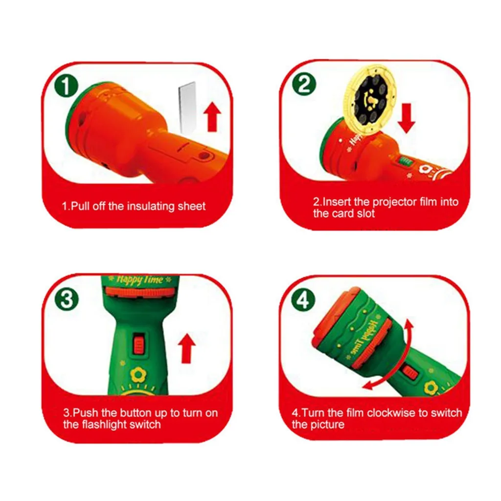 Diese Diaprojektor-Taschenlampe besteht aus sicherem und hochwertigem ABS-Material und wurde mit 3 Projektoren und 24 verschiedenen Bildern gebaut. Es ist für Kinder sehr einfach zu bedienen und die Bilder davon sind farbenfroh und lebendiger. Sie können es als Nachtlicht verwenden, das Ihre kleinen Kinder in der Schlafenszeit begleiten kann, und als frühes pädagogisches Werkzeug, das dem Kind hilft, den optischen gesunden Menschenverstand zu lernen. Es ist auch ein perfektes Geschenk für Weihnachten, Geburtstag.