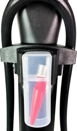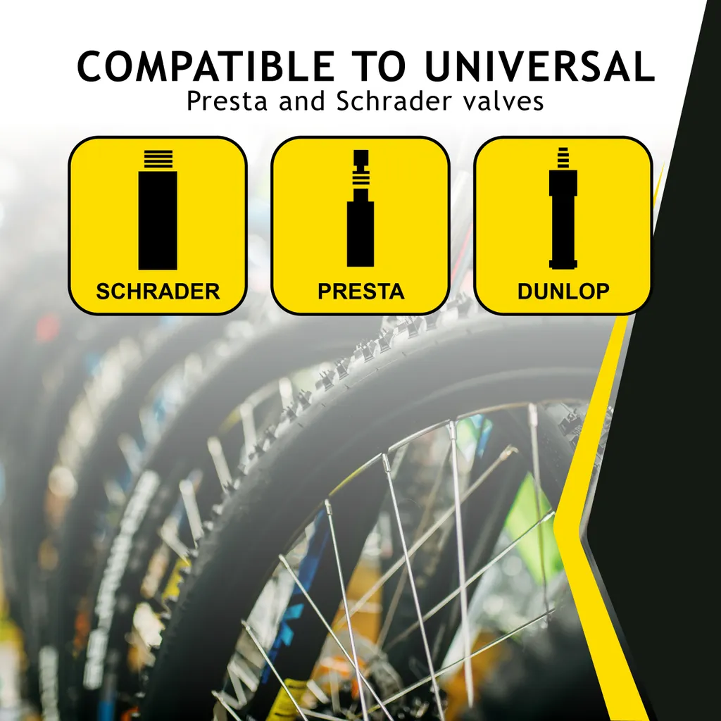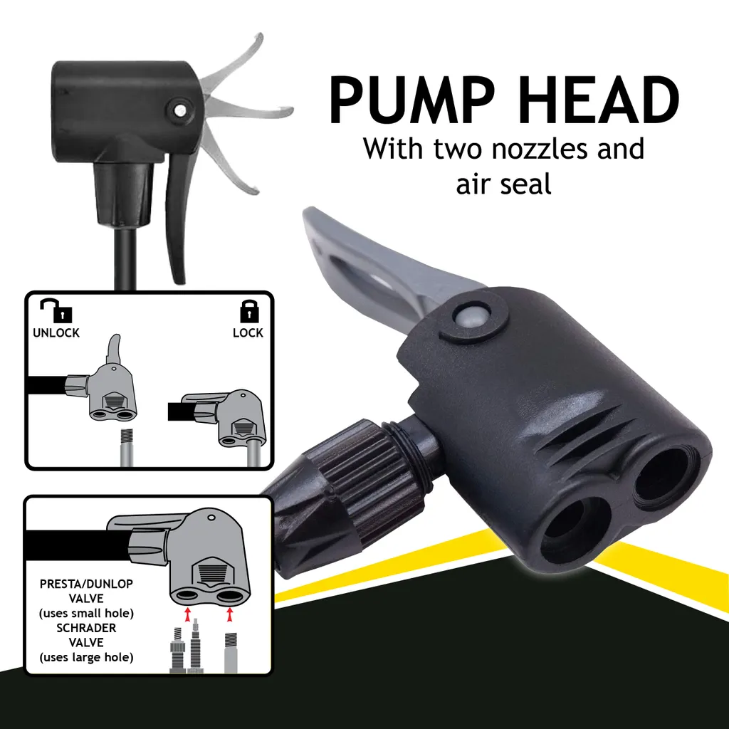 Mit dem praktischen Pumpenkopf können Sie alle Reifen mit allen Arten von Ventilen aufpumpen. Für das Schrader- und Presta-Ventil, auch bekannt als französisches Ventil, verwenden Sie das kleine Loch. Für das Dunlop-Ventil verwenden Sie das große Loch. Mit dem Lock-System fixieren Sie den Ventilkopf einfach auf dem Ventil. So kann er nicht jedes Mal herausrutschen und Sie können Ihren Reifen problemlos aufpumpen.