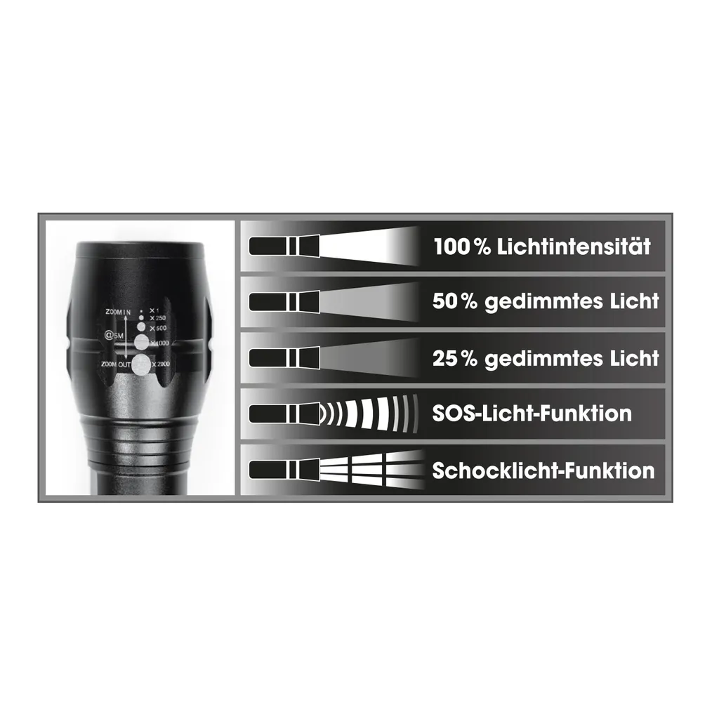 - Hinweise: Der Artikel ist zur Verwendung als Taschenlampe geeignet und verfügt über eine Zoomfunktion sowie über 5 verschiedene Modi (25 %, 50 %, 100 %, Flash, SOS). Der Artikel ist kein Spielzeug!