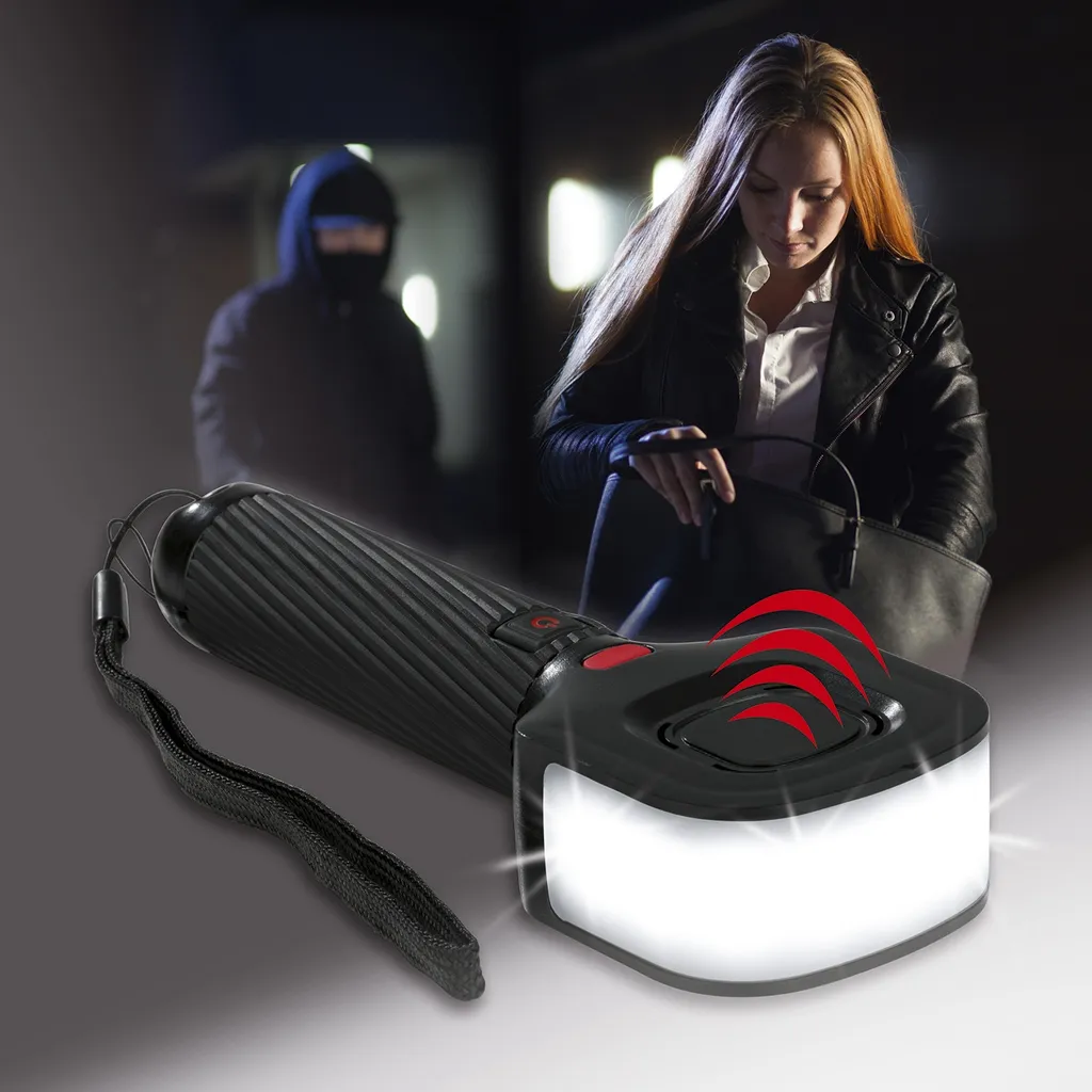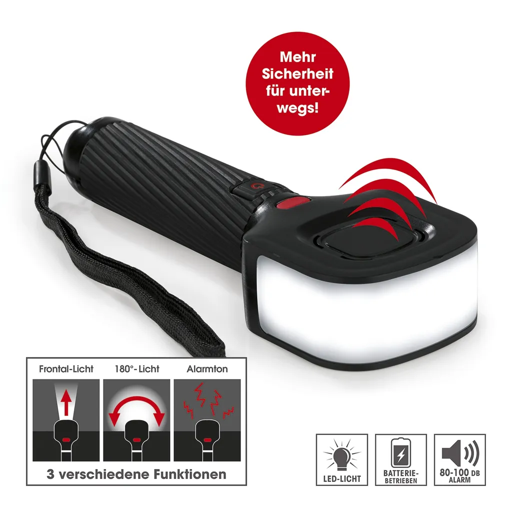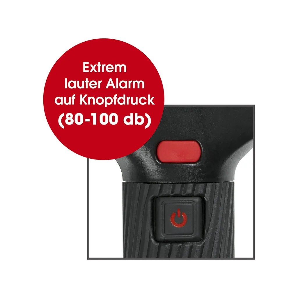 2 verschiedene Leuchtmodi stehen Ihnen zur Verfügung: Wählen Sie ganz nach Bedarf und Umgebung zwischen hellem Frontal-Licht oder praktischer 180°-Beleuchtung. In unangenehmen Situationen können Sie auf Knopfdruck einen Schrillalarm aktivieren. Damit ziehen Sie die Aufmerksamkeit Ihrer Umgebung und damit potenzieller Helfer auf sich. Der Alarmton ist selbst in großer Entfernung noch deutlich zu hören und hält so lange an, bis Sie ihn wieder ausschalten.